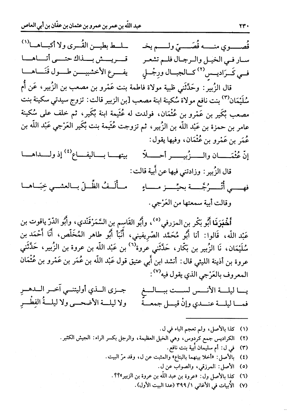 قصوي منه قصي ولم يخ * لط بطين القرى ولا أكباها (1) سار في الخيل والرجال فلم تشعر * قريش بذاك حتى أتاها في كراديس (2) كالجبال ورجل * يفرع الأخشبين طول قناها * قال الزبير وحدثني ظبية مولاة فاطمة بنت عمرو بن مصعب بن الزبير عن أم سليمان (3) بنت نافع مولاة سكينة ابنة مصعب بن الزبير قالت تزوج سيدتي سكينة بنت مصعب بكير بن عمرو بن عثمان فولدت له عثيمة ابنة بكير ثم خلف على سكينة عامر بن حمزة بن عبد الله بن الزبير ثم تزوجت عثيمة بنت بكير العرجي عبد الله بن عمر بن عمرو بن عثمان وفيها يقول * إن عثمان والزبير أحلا * بيتها باليفاع (4) إذ ولداها * قال الزبير وزادتني فيها عن أبيه قالت * فهي اترجه بحيز ماء * مألف الظل بالعشي خباها * وقالت أبية سمعتها من العرجي خبرنا أبو بكر بن المرزفي (5) وابو القاسم بن السمرقندي وأبو الدر ياقوت بن عبد الله قالوا أنا أبو محمد الصريفيني أنبأ أبو طاهر المخلص أنا أحمد بن سليمان نا الزبير بن بكار حدثني عروة (6) بن عبد الله بن عروة بن الزبير حدثني عروة بن أذينة الليثي قال أنشد ابن أبي عتيق قول عبد الله بن عمر بن عمرو بن عثمان المعروف بالعرجي الذي يقول فيه (7) * يا ليلة الأنس لست ببالغ * جزى الذي أوليتني آخر الدهر فما ليلة عندي وإن قيل جمعة * ولا ليلة الأضحى ولا ليلة الفطر