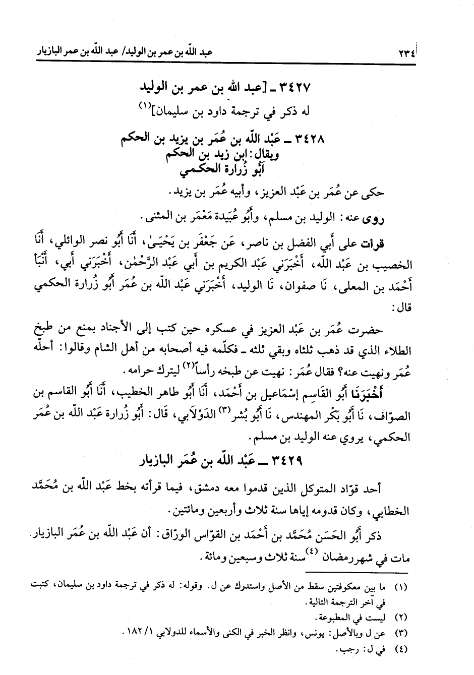 3429 - عبد الله بن عمر البازيار أحد قواد المتوكل الذين قدموا معه دمشق فيما قرأته بخط عبد الله بن محمد الخطابي وكان قدومه إياها سنة ثلاث وأربعين ومائتين ذكر أبو الحسن محمد بن أحمد بن القواس الوراق أن عبد الله بن عمر البازيار مات في شهر رمضان (4) سنة ثلاث وسبعين ومائة