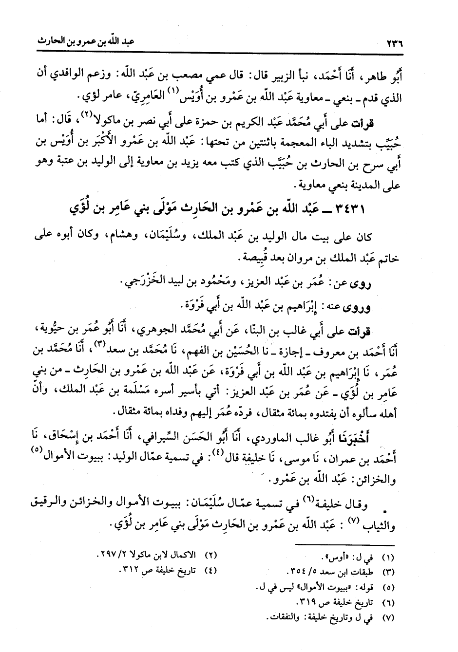 3431 - عبد الله بن عمرو بن الحارث مولى بني عامر بن لؤي كان على بيت مال الوليد بن عبد الملك وسليمان وهشام وكان أبوه على خاتم عبد الملك بن مروان بعد قبيصة روى عن عمر بن عبد العزيز ومحمود بن لبيد الخزرجي وروى عنه إبراهيم بن عبد الله بن أبي فروة قرأت على أبي غالب بن البنا عن أبي محمد الجوهري أنا أبو عمر بن حيوية أنا أحمد بن معروف إجازة نا الحسين بن الفهم نا محمد بن سعد (3) أنا محمد بن عمر نا إبراهيم بن عبد الله بن أبي فروة عن عبد الله بن عمرو بن الحارث من بني عامر بن لؤي عن عمر بن عبد العزيز أتى بأسير أسره مسلمة بن عبد الملك وأن أهله سألوه أن يفتدوه بمائة مثقال فرده عمر إليهم وفداه بمائة مثقال أخبرنا أبو غالب الماوردي أنا أبو الحسن السيرافي أنا أحمد بن إسحاق نا أحمد بن عمران نا موسى نا خليفة قال (4) في تسمية عمال الوليد ببيوت الأموال (5) والخزائن عبد الله بن عمرو وقال خليفة (6) في تسمية عمال سليمان ببيوت الأموال والخزائن والرقيق والثياب (7) عبد الله بن عمرو بن الحارث مولى بني عامر بن لؤي