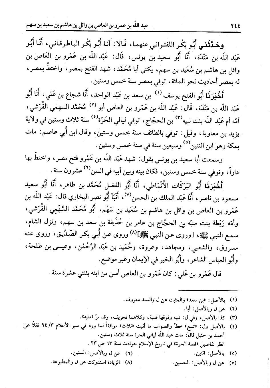 وحدثني أبو بكر اللفتواني عنهما قالا أنا أبو بكر الباطرقاني أنا أبو عبد الله بن مندة أنا أبو سعيد بن يونس قال عبد الله بن عمرو بن العاص بن وائل بن هاشم بن سعيد بن سهم يكنى أبا محمد شهد الفتح بمصر واختط بمصر له بمصر أحاديث نحو المائة توفي بمصر سنة خمس وستين أخبرنا أبو الفتح يوسف (1) بن سعد بن عبد الواحد أنا شجاع بن علي أنا أبو عبد الله بن منده قال عبد الله بن عمرو بن العاص أبو (2) محمد السهمي القرشي أمه أم عبد الله بنت نبيه (3) بن الحجاج توفي ليالي الحرة (4) سنة ثلاث وستين في ولاية يزيد بن معاوية وقيل توفي بالطائف سنة خمس وستين وقال ابن أبي عاصم مات بمكة وهو ابن اثنتين (5) وسبعين سنة في سنة خمس وستين وسمعت أبا سعيد بن يونس يقول شهد عبد الله بن عمرو فتح مصر واختط بها دارا وتوفي سنة خمس وستين فكان بينه وبين أبيه في السن (6) عشرون سنة أخبرنا أبو البركات الأنماطي أنا أبو الفضل محمد بن طاهر أنا أبو سعيد مسعود بن ناصر أنا عبد الملك بن الحسن (7) أنبأ أبو نصر البخاري قال عبد الله بن عمرو بن العاص بن وائل بن هاشم بن سعيد بن سهم أبو محمد السهمي القرشي وأمه ريطة بنت منبه بن الحجاج بن عامر بن حذيفة بن سعد بن سهم ونزل الشام سمع النبي (صلى الله عليه وسلم) (8) وروى عن النبي (صلى الله عليه وسلم) وروى عن أبي بكر الصديق وروى عنه مسروق والشعبي ومجاهد وعروة وحميد بن عبد الرحمن وعيسى بن طلحة وأبو العباس الشاعر وأبو الخير في الإيمان وغير موضع قال عمرو بن علي كان عمرو بن العاص أسن من ابنه بثنتي عشرة سنة