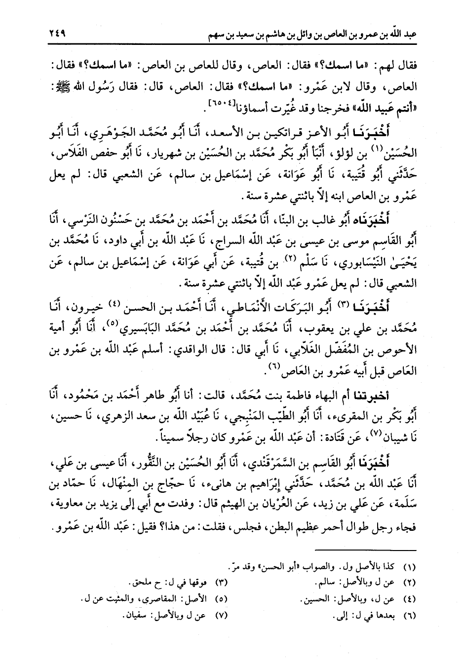 فقال لهم ما اسمك فقال العاص وقال للعاص بن العاص ما اسمك فقال العاص وقال لابن عمرو ما اسمك فقال العاص قال فقال رسول الله (صلى الله عليه وسلم) أنتم عبيد الله فخرجنا وقد غيرت اسماؤنا أخبرنا أبو الأعز بن قراتكين بن الأسعد أنا أبو محمد الجوهري أنا أبو الحسين (1) بن لؤلؤ انبأ أبو بكر محمد بن الحسين بن شهريار نا أبو حفص الفلاس حدثني أبو قتيبة نا أبو عوانة عن إسماعيل بن سالم عن الشعبي قال لم يعل عمرو بن العاص ابنه إلا باثنتي عشرة سنة أخبرناه أبو غالب بن البنا أنا محمد بن أحمد بن محمد بن حسنون النرسي أنا أبو القاسم موسى بن عيسى بن عبد الله السراج نا عبد الله بن أبي داود نا محمد بن يحيى النيسابوري نا سلم (2) بن قتيبة عن أبي عوانة عن إسماعيل بن سالم عن الشعبي قال لم يعل عمرو عبد الله إلا باثنتي عشرة سنة اخبرنا (3) أبو البركات الأنماطي أنا أحمد بن الحسن (4) خيرون أنا محمد بن علي بن يعقوب أنا محمد بن أحمد بن محمد البابسيري (5) أنا أبو أمية الأحوص بن المفضل الغلابي نا أبي قال قال الواقدي أسلم عبد الله بن عمرو بن العاص قبل أبيه عمرو بن العاص (6) أخبرتنا أم البهاء فاطمة بنت محمد قالت أنا أبو طاهر أحمد بن محمود أنا أبو بكر بن المقرئ أنا أبو الطيب المنبجي نا عبيد الله بن سعد الزهري نا حسين نا شيبان (7) عن قتادة أن عبد الله بن عمرو كان رجلا سمينا أخبرنا أبو القاسم بن السمرقندي أنا أبو الحسين بن النقور أنا عيسى بن علي أنا عبد الله بن محمد حدثني إبراهيم بن هانئ نا حجاج بن المنهال نا حماد بن سلمة عن علي بن زيد عن العريان بن الهيثم قال وفدت مع أبي إلى يزيد بن معاوية فجاء رجل طوال أحمر عظيم البطن فجلس فقلت من هذا فقيل عبد الله بن عمرو