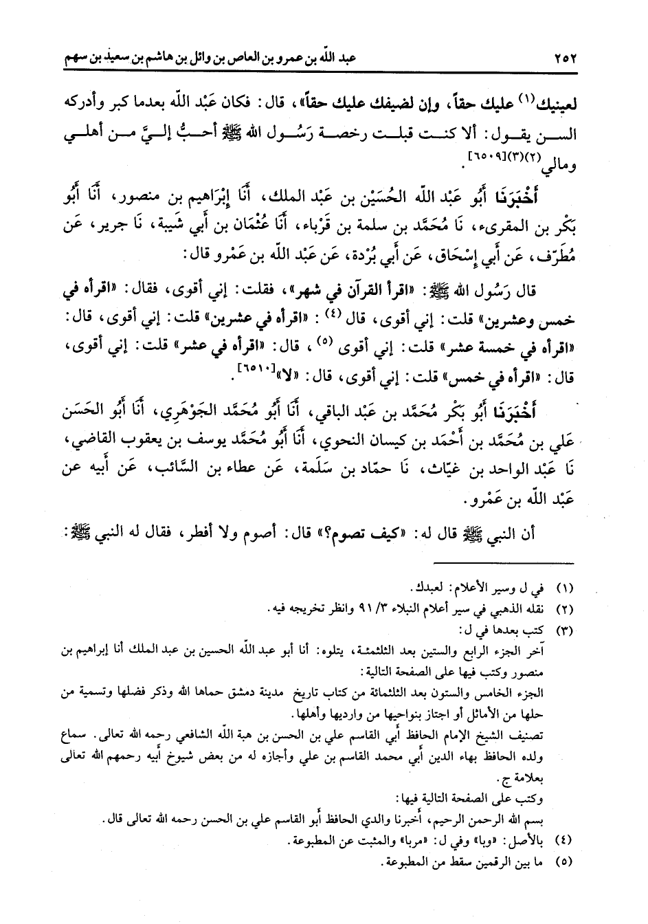 لعينيك (1) عليك حقا وإن لضيفك عليك حقا قال فكان عبد الله بعدما كبر وأدركه السن يقول ألا كنت قبلت رخصة رسول الله (صلى الله عليه وسلم) أحب إلي من أهلي ومالي (2) (3) أخبرنا أبو عبد الله الحسين بن عبد الملك أنا إبراهيم بن منصور أنا أبو بكر بن المقرئ نا محمد بن سلمة بن قرباء أنا عثمان بن أبي شيبة نا جرير عن مطرف عن أبي إسحاق عن أبي بردة عن عبد الله بن عمرو قال قال رسول الله (صلى الله عليه وسلم) أقرا القرآن في شهر فقلت إني أقوى فقال اقرأه في خمس وعشرين قلت إني اقوى قال (4) اقرأه في عشرين قلت إني أقوى قال اقرأه في خمسة عشر قلت إني أقوى (5) قال اقرأه في عشر قلت إني أقوى قال اقرأه في خمس قلت إني أقوى قال لا أخبرنا أبو بكر محمد بن عبد الباقي أنا أبو محمد الجوهري أنا أبو الحسن علي بن محمد بن أحمد بن كيسان النحوي أنا أبو محمد بن يوسف بن يعقوب القاضي نا عبد الواحد بن غياث نا حماد بن سلمة عن عطاء بن السائب عن أبيه عن عبد الله بن عمرو أن النبي (صلى الله عليه وسلم) قال له كيف تصوم قال أصوم ولا أفطر فقال له النبي (صلى الله عليه وسلم)
