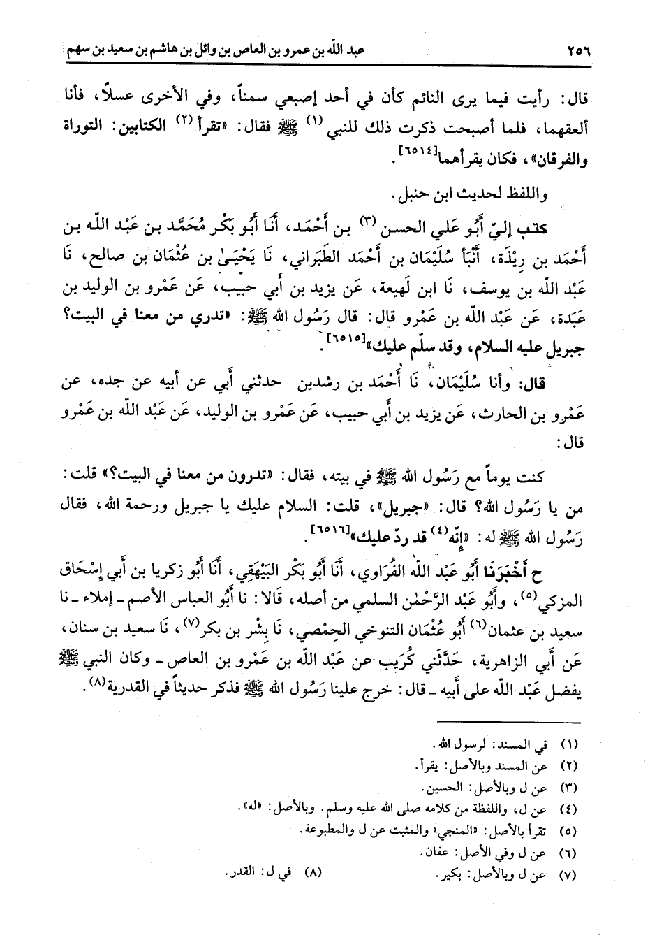 قال رايت فيما يرى النائم كأن أحد إصبعي سمنا وفي الأخرى عسلا فأنا ألعقهما فلما أصبحت ذكرت ذلك للنبي (1) (صلى الله عليه وسلم) فقال تقرأ (2) الكتابين التوراة والفرقان فكان يقرأهما ح واللفظ لحديث ابن حنبل كتب إلي أبو علي الحسن (3) بن أحمد أنا أبو بكر محمد بن عبد الله بن أحمد بن ريذة أنبأ سليمان بن أحمد الطبراني نا يحيى بن عثمان بن صالح نا عبد الله بن يوسف نا ابن لهيعة عن يزيد بن أبي حبيب عن عمرو بن الوليد بن عبدة عن عبد الله بن عمرو قال قال رسول الله (صلى الله عليه وسلم) تدري من معنا في البيت جبريل عليه السلام وقد سلم عليك قال وأنا سليمان نا أحمد بن رشدين حدثني أبي عن أبيه عن جده عن عمرو بن الحارث عن يزيد بن أبي حبيب عن عمرو بن الوليد عن عبد الله بن عمرو قال كنت يوما مع رسول الله (صلى الله عليه وسلم) في بيته فقال تدرون من معنا في البيت قلت من يا رسول الله قال جبريل قلت السلام عليك يا جبريل ورحمة الله فقال رسول الله (صلى الله عليه وسلم) له إنه (4) قد رد عليك ح وأخبرنا أبو عبد الله الفراوي أنا أبو بكر البيهقي أنا أبو زكريا بن أبي إسحاق المزكي (5) وأبو عبد الرحمن السلمي من أصله قالا نا أبو العباس الأصم إملاء نا سعيد بن عثمان (6) أبو عثمان التنوخي الحمصي نا بشر بن بكر (7) نا سعيد بن سنان عن أبي الزاهرية حدثني كريب عن عبد الله بن عمرو بن العاص وكان النبي (صلى الله عليه وسلم) يفضل عبد الله على أبيه قال خرج علينا رسول الله (صلى الله عليه وسلم) فذكر حديثا في القدرية (8)