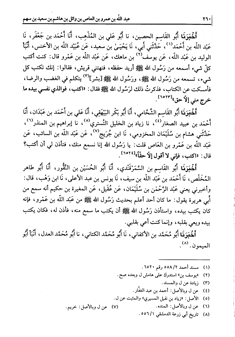 أخبرنا أبو القاسم الحصين نا أبو علي بن المذهب أنا أحمد بن جعفر نا عبد الله بن أحمد (1) حدثني أبي نا يحيى بن سعيد عن عبيد الله بن الأخنس أنبأ الوليد بن عبد الله عن عن يوسف (2) بن ماهك عن عبد الله بن عمرو قال كنت أكتب كل شئ أسمعه من رسول الله (صلى الله عليه وسلم) أريد حفظه فنهتني قريش فقالوا إنك تكتب كل شئ تسمعه من رسول الله (صلى الله عليه وسلم) ورسول الله (صلى الله عليه وسلم) بشر (3) يتكلم في الغضب والرضا فأمسكت عن الكتاب فذكرت ذلك لرسول الله (صلى الله عليه وسلم) فقال اكتب فوالذي نفسي بيده ما خرج مني إلا حق أخبرنا أبو القاسم الشحامي أنا أبو بكر البيهقي أنا علي بن أحمد بن عبدان أنا أحمد بن عبيد الصغار (4) نا زياد بن الخليل التستري (5) نا إبراهيم بن المنذر (6) حدثني هشام بن سليمان المخزومي نا ابن جريج (7) عن عبد الله بن السائب عن عبد الله بن عمرو بن العاص قلت يا رسول الله إنا نسمع منك فتأذن لي أن أكتب قال اكتب فإني لا أقول إلا حقا أخبرنا أبو القاسم بن السمرقندي أنا أبو الحسين بن النقور أنا أبو طاهر المخلص نا أحمد بن عبد الله بن سيف نا يونس بن عبد الأعلى نا ابن وهب قال وأخبرني يعني عبد الرحمن بن سليمان عن عقيل عن المغيرة بن حكيم أنه سمع من أبي هريرة يقول ما كان أحد أعلم بحديث رسول الله (صلى الله عليه وسلم) من عبد الله بن عمرو فإنه كان يكتب بيده واستأذن رسول الله (صلى الله عليه وسلم) أن يكتب ما سمع منه فأذن له فكان يكتب بيده ويعي بقبله وإنما كنت أعي بقلبي أخبرنا أبو محمد بن الأكفاني نا أبو محمد الكتاني نا أبو محمد العدل أنبأ أبو الميمون (8)