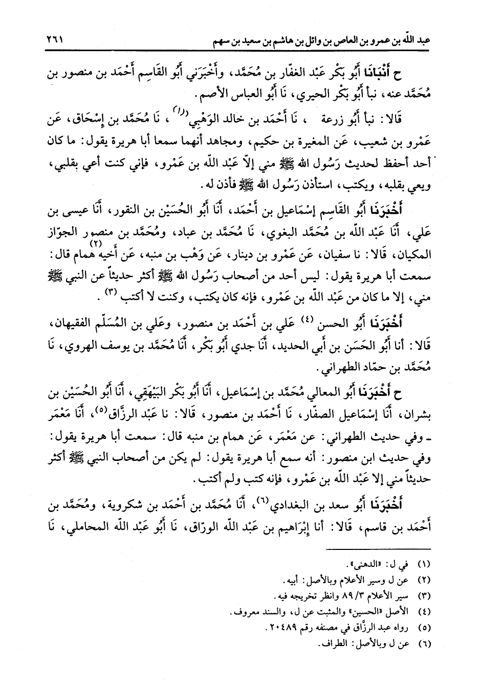 ح أنبأنا أبو بكر عبد الغفار بن محمد وأخبرني أبو القاسم أحمد بن منصور بن محمد عنه نبأ أبو بكر الحيري نا أبو العباس الأصم قالا نبأ أبو زرعة نا أحمد بن خالد الوهبي (1) نا محمد بن إسحاق عن عمرو بن شعيب عن المغيرة بن حكيم ومجاهد أنهما سمعا أبا هريرة يقول ما كان أحد أحفظ لحديث رسول الله (صلى الله عليه وسلم) مني إلا عبد الله بن عمرو فإني كنت أعي بقلبي ويعي بقلبه ويكتب استأذن رسول الله (صلى الله عليه وسلم) فأذن له أخبرنا أبو القاسم إسماعيل بن أحمد أنا أبو الحسين بن النقور أنا عيسى بن علي أنا عبد الله بن محمد البغوي نا محمد بن عباد ومحمد بن منصور الجواز المكيان قالا نا سفيان عن عمرو بن دينار عن وهب بن منبه عن أخيه (2) همام قال سمعت أبا هريرة يقول ليس أحد من أصحاب رسول الله (صلى الله عليه وسلم) أكثر حديثا عن النبي (صلى الله عليه وسلم) مني إلا ما كان من عبد الله بن عمرو فإنه كان يكتب وكنت لا أكتب (3) أخبرنا أبو الحسن (4) علي بن أحمد بن منصور وعلي بن المسلم الفقيهان قالا أنا أبو الحسن بن أبي الحديد أنا جدي أبو بكر أنا محمد بن يوسف الهروي نا م حمد بن حماد الطهراني ح أخبرنا أبو المعالي محمد بن إسماعيل أنا أبو بكر البيهقي أنا أبو الحسسين بن بشران أنا إسماعيل الصفار نا أحمد بن منصور قالا نا عبد الرزاق (5) أنا معمر وفي حديث الطهراني عن معمر عن همام بن منبه قال سمعت أبا هريرة يقول وفي حديث ابن منصور أنه سمع أبا هريرة يقول لم يكن من أصحاب النبي (صلى الله عليه وسلم) أكثر حديثا مني إلا عبد الله بن عمرو فإنه كتب ولم أكتب أخبرنا أبو سعد بن البغدادي (6) أنا محمد بن أحمد بن شكروية ومحمد بن أحمد بن قاسم قالا أنا إبراهيم بن عبد الله الوراق نا أبو عبد الله المحاملي نا