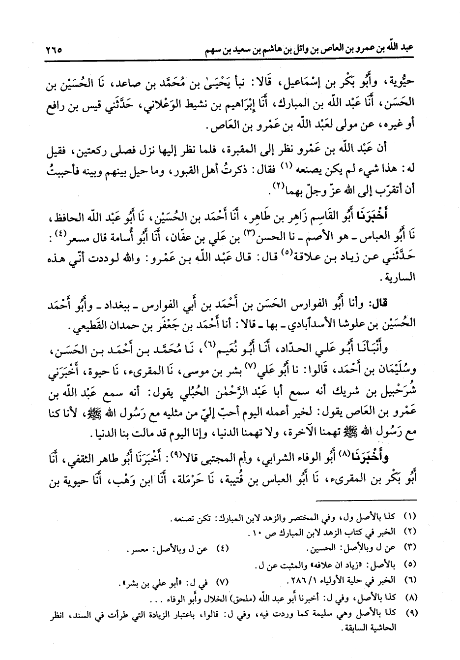 حيوية وابو بكر بن إسماعيل قالا نبأ يحيى بن محمد بن صاعد نا الحسين بن الحسن أنا عبد الله بن المبارك أنا إبراهيم بن نشيط الوعلاني حدثني قيس بن رافع أو غيره عن مولى لعبد الله بن عمرو بن العاص أن عبد الله بن عمرو نظر إلى المقبرة فلما نظر إليها نزل فصلى ركعتين فقيل له هذا شئ لم يكن يصنعه (1) فقال ذكرت أهل القبور وما حيل بينهم وبينه فأحببت أن أتقرب إلى الله عز وجل بهما (2) أخبرنا أبو القاسم زاهر بن طاهر أنا أحمد بن الحسين نا أبو عبد الله الحافظ نا أبو العباس هو الأصم نا الحسن (3) بن علي بن عفان أنا أبو أسامة قال مسعر (4) حدثني عن زياد بن علاقة (5) قال قال عبد الله بن عمرو والله لوددت أني هذه السارية قال وأنا أبو الفوارس الحسن بن أحمد بن أبي الفوارس ببغداد وابو أحمد الحسين بن علوشا الأسد آبادي بها قالا أنا أحمد بن جعفر بن حمدان القطيعي وأنبأنا أبو علي الحداد أنا أبو نعيم (6) نا محمد بن أحمد بن الحسن وسليمان بن أحمد قالوا نا أبو علي (7) بشر بن موسى نا المقرئ نا حيوة أخبرني شرحبيل بن شريك أنه سمع أبا عبد الرحمن الحبلي يقول أنه سمع عبد الله بن عمرو بن العاص يقول لخير أعمله اليوم أحب إلي من مثليه مع رسول الله (صلى الله عليه وسلم) لأنا كنا مع رسول الله (صلى الله عليه وسلم) تهمنا الآخرة ولا تهمنا الدنيا وإنا اليوم قد مالت بنا الدنيا وأخبرنا (8) أبو الوفاء الشرابي وأم المجتبى قالا (9) أخبرنا أبو طاهر الثقفي أنا أبو بكر بن المقرئ نا أبو العباس بن قتيبة نا حرملة أنا ابن وهب أنا حيوية بن