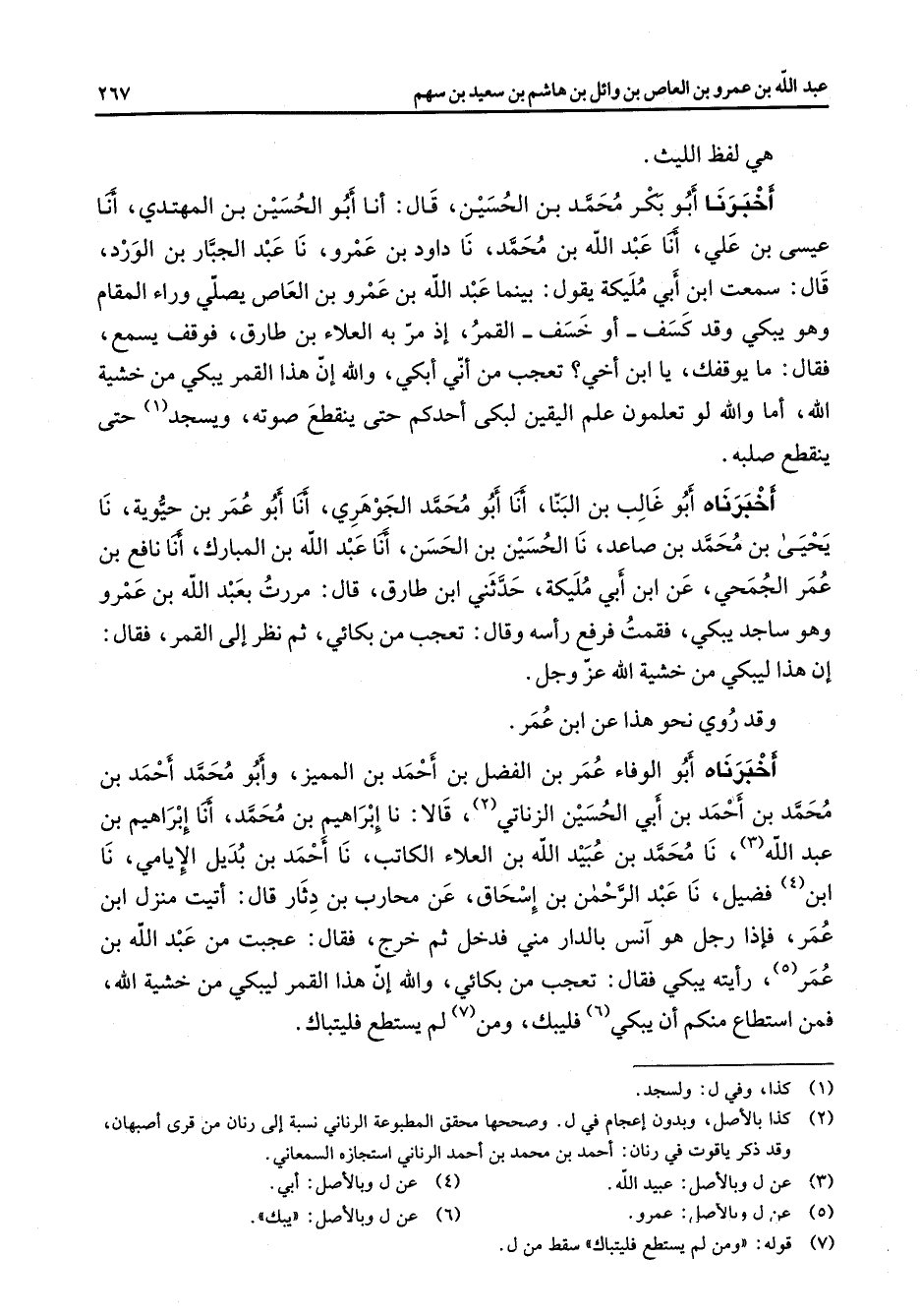 هي لفظ الليث اخبرنا أبو بكر محمد بن الحسين قال أنا أبو الحسين بن المهتدي أنا عيسى بن علي أنا عبد الله بن محمد نا داود بن عمرو نا عبد الحبار بن الورد قال سمعت ابن أبي مليكة يقول بينما عبد الله بن عمرو بن العاص يصلي وراء المقام وهو يبكي وقد كسف أو خسف القمر إذ مر به العلاء بن طارق فوقف يسمع فقال ما يوقفك يا ابن أخي تعجب من أني أبكي والله إن هذا القمر يبكي من خشية الله أما والله لو تعلمون علم اليقين لبكى أحدكم حتى ينقطع صوته ويسجد (1) حتى ينقطع صلبه أخبرناه أبو غالب بن البنا أنا أبو محمد الجوهري أنا أبو عمر بن حيوية نا يحيى بن محمد بن صاعد نا الحسين بن الحسن أنا عبد الله بن المبارك أنا نافع بن عمر الجمحي عن ابن أبي مليكة حدثني ابن طارق قال مررت بعبد الله بن عمرو وهو ساجد يبكي فقمت فرفع رأسه وقال تعجب من بكائي ثم نظر إلى القمر فقال إن هذا ليبكي من خشية الله عز وجل وقد روي نحو هذا عن ابن عمر أخبرناه أبو الوفاء عمر بن الفضل بن أحمد بن المميز وأبو محمد أحمد بن محمد بن أحمد بن أبي الحسين الزناتي (2) قالا نا إبراهيم بن محمد أنا إبراهيم بن عبد الله (3) نا محمد بن عبيد الله بن العلاء الكاتب نا أحمد بن بديل الإيامي نا ابن (4) فضيل نا عبد الرحمن بن إسحاق عن محارب بن دثار قال أتيت منزل ابن عمر فإذا رجل هو آنس بالدار مني فدخل ثم خرج فقال عجبت من عبد الله بن عمر (5) رأيته يبكي فقال تعجب من بكائي والله إن هذا القمر ليبكي من خشية الله فمن استطاع منكم أن يبكي (6) فليبك ومن (7) لم يستطع فليتباك