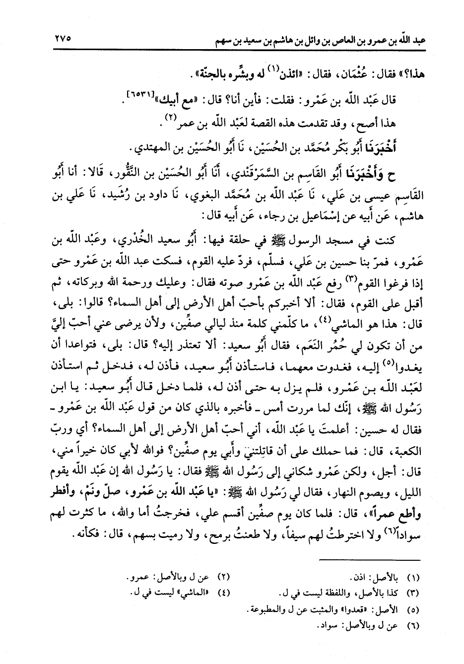 فقال عثمان فقال ائذن (1) له وبشره بالجنة قال عبد الله بن عمرو فقلت فأين أنا قال مع أبيك هذا أصح وقد تقدمت هذه القصة لعبد الله بن عمر (2) أخبرنا أبو بكر محمد بن الحسين نا أبو الحسين بن المهتدي ح وأخبرنا أبو القاسم بن السمرقندي أنا أبو الحسين بن النقور قالا أنا أبو القاسم عيسى بن علي نا عبد الله بن محمد البغوي نا داود بن رشيد نا علي بن هاشم عن أبيه عن إسماعيل بن رجاء عن أبيه قال كنت في مسجد الرسول (صلى الله عليه وسلم) في حلقة فيها أبو سعيد الخدري وعبد الله بن عمرو فمر بنا حسسين بن علي فسلم فرد عليه القوم فسكت عبد الله بن عمرو حتى إذا فرغوا القوم (3) رفع عبد الله بن عمرو صوته فقال وعليك ورحمة الله وبركاته ثم أقبل على القوم فقال ألا أخبركم بأحب أهل الأرض إلى أهل السماء قالوا بلى قال هذا هو الماشي (4) ما كلمني كلمة منذ ليالي صفين ولأن يرضى عني أحب إلي من أن تكون لي حمر النعم فقال أبو سعيد ألا تعتذر إليه قال بلى فتواعدا أن يغدوا (5) إليه فغدوت معهما فاستأذن أبو سعيد فأذن له فدخل ثم استأذن لعبد الله بن عمرو فلم يزل به حتى أذن له فلما دخل قال أبو سعيد يا ابن رسول الله (صلى الله عليه وسلم) إنك لما مررت أمس فأخبره بالذي كان من قول عبد الله بن عمرو فقال له حسين أعلمت يا عبد الله أني أحب أهل الأرض إلى أهل السماء أي ورب الكعبة قال فما حملك على أن قاتلتني وأبي يوم صفين فوالله لأبي كان خيرا مني قال أجل ولكن عمرو شكاني إلى رسول الله (صلى الله عليه وسلم) فقال يا رسول الله إن عبد الله يقوم الليل ويصوم النهار فقال لي رسول الله (صلى الله عليه وسلم) يا عبد الله بن عمرو صل ونم وأفطر وأطع عمرا قال فلما كان يوم صفين أقسم علي فخرجت أما والله ما كثرت لهم سوادا (6) ولا اخترطت لهم سيفا ولا طعنت برمح ولا رميت بسهم قال فكأنه