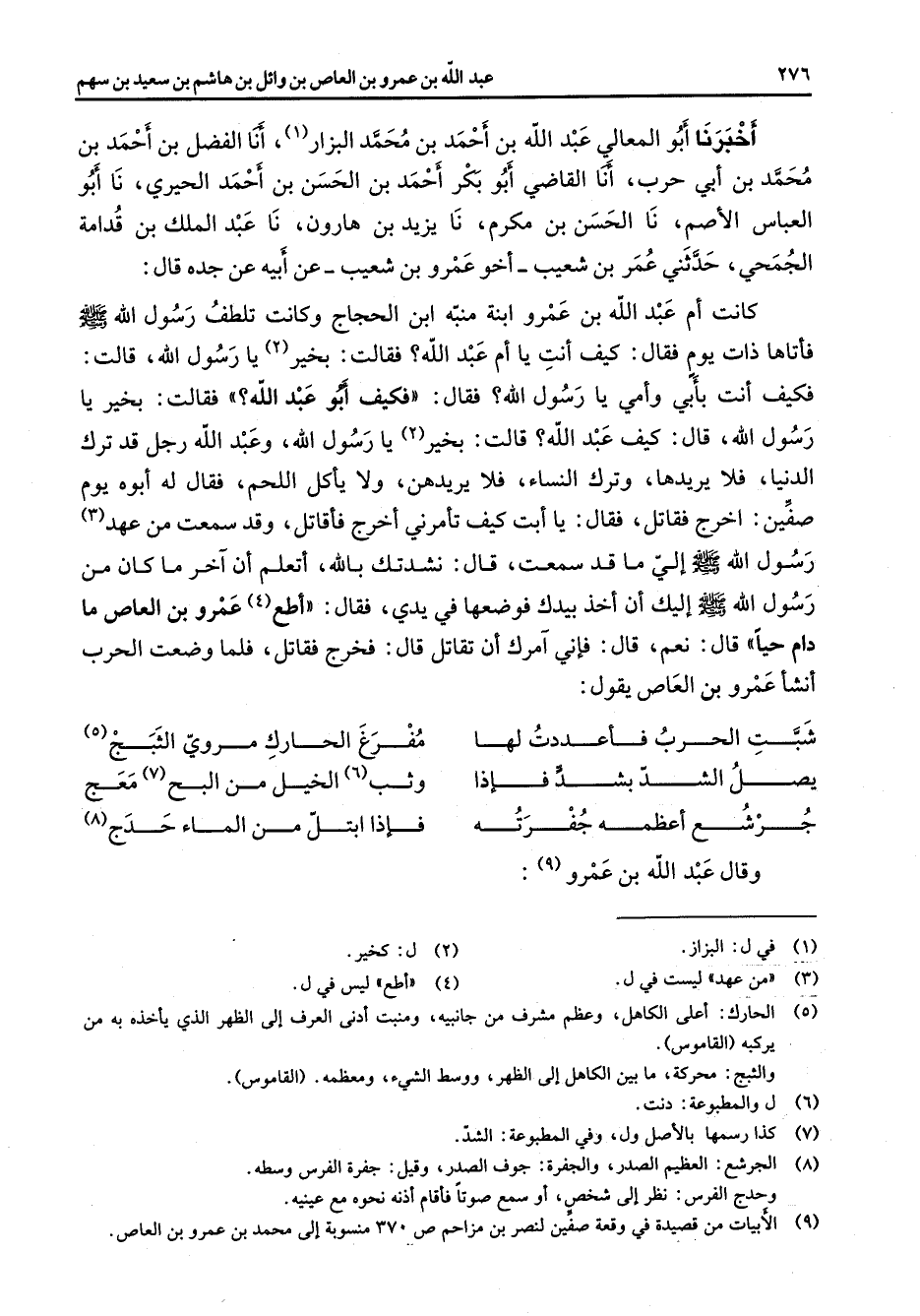 أخبرنا أبو المعالي عبد الله بن أحمد بن محمد البزار (1) أنا الفضل بن أحمد بن محمد بن أبي حرب أنا القاضي أبو بكر أحمد بن الحسن بن أحمد الحيري نا أبو العباس الأصم نا الحسن بن مكرم نا يزيد بن هارون نا عبد الملك بن قدامة الجمحي حدثني عمر بن شعيب أخو عمرو بن شعيب عن أبيه عن جده قال كانت أم عبد الله بن عمرو ابنة منبه بن الحجاج وكانت تلطف رسول الله (صلى الله عليه وسلم) فأتاها ذات يوم فقال كيف أنت يا أم عبد الله فقالت بخير (2) يا رسول الله قالت فكيف أنت بأبي وأمي يا رسول الله فقال فكيف أبو عبد الله فقالت بخير (2) يا رسول الله قال كيف عبد الله قالت بخير يا رسول الله وعبد الله رجل قد ترك الدنيا فلا يريدها وترك النساء فلا يريدهن ولا يأكل اللحم فقال له أبوه يوم صفين أخرج فقاتل فقال يا أبت كيف تأمرني أخرج فأقاتل وقد سمعت من عهد (3) رسول الله (صلى الله عليه وسلم) إلي ما قد سمعت قال نشدتك بالله أتعلم أن آخر ما كان من رسول الله (صلى الله عليه وسلم) إليك أن أخذ بيدك فوضعها في يدي فقال أطع (4) عمرو بن العاص ما دام حيا قال نعم قال فإني آمرك أن تقاتل قال فخرج فقاتل فلما وضعت الحرب أنشأ عمرو بن العاص يقول * شبت الحرب فأعددت لها * مفرغ الحارك مروي الثبج (5) يصل الشد بشد فإذا * وثب (6) الخيل من البح (7) معج جرشع أعظمه جفرته * فإذا ابتل من الماء حدج (8) * وقال عبد الله بن عمرو (9)