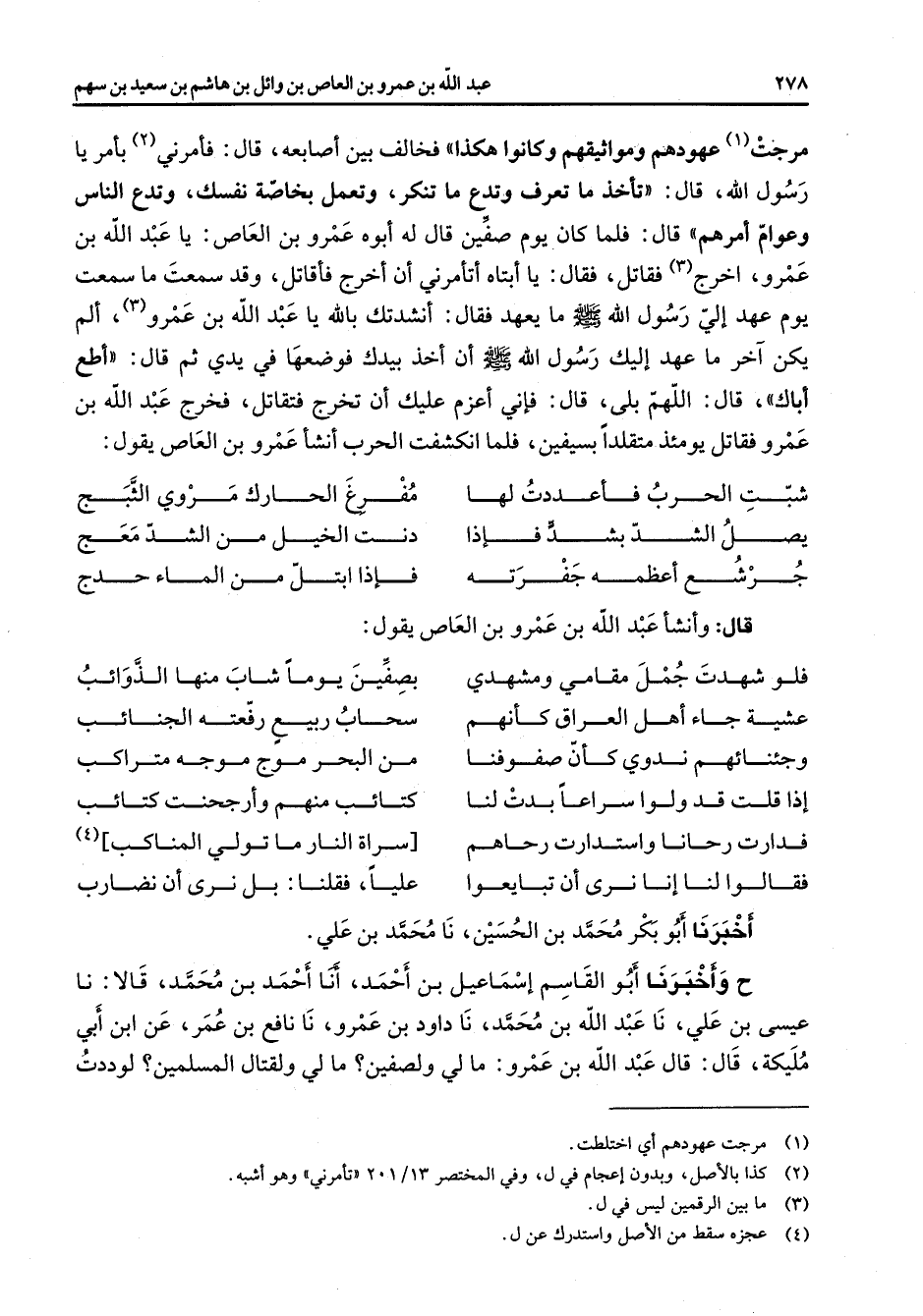 مرجت (1) عهودهم ومواثيقهم وكانوا هكذا فخالف بين أصابعه قال فأمرني (2) بأمر يا رسول الله قال تأخذ ما تعرف وتدع ما تنكر وتعمل بخاصة نفسك وتدع الناس وعوام أمرهم قال فلما كان يوم صفين قال له أبوه عمرو بن العاص يا عبد الله بن عمرو اخرج (3) فقاتل فقال يا أبتاه أتأمرني أن أخرج فأقاتل وقد سمعت ما سمعت يوم عهد إلي رسول الله (صلى الله عليه وسلم) ما يعهد فقال أنشدك بالله يا عبد الله بن عمرو (3) ألم يكن آخر ما عهد إليك رسول الله (صلى الله عليه وسلم) أن أخذ بيدك فوضعها في يدي ثم قال أطع أباك قال اللهم بلى قال فإني أعزم عليك أن تخرج فتقاتل فخرج عبد الله بن عمرو فقاتل يومئذ متقلدا بسيفين فلما انكشفت الحرب أنشأ عمرو بن العاص يقول * شبت الحرب فأعددت لها * مفرغ الحارك مروي الثبج يصل الشد بشد فإذا * دنت الخيل من الشد معج * جرشع أعظمه جفرته * فإذا ابتل من الماء حدج * قال وأنشأ عبد الله بن عمرو بن العاص يقول * فلو شهدت جمل مقامي ومشهدي * بصفين يوما شاب منها الذوائب عشية جاء أهل العراق كأنهم * سحاب ربيع رفعته الجنائب وجئناهم ندوي كأن صفوفنا * من البحر موج موجه متراكب إذا قلت قد ولوا سراعا بدت لنا * كتائب منهم وأرجحنت كتائب فدارت رحانا واستدارت رحاهم * سراة النار ما تولي المناكب (4) فقالوا لنا إنا نرى أن تبايعوا * عليا فقلنا بل نرى أن نضارب * أخبرنا أبو بكر محمد بن الحسين نا محمد بن علي ح وأخبرنا أبو القاسم إسماعيل بن أحمد أنا أحمد بن محمد قالا نا عيسى بن علي نا عبد الله بن محمد نا داود بن عمرو نا نافع بن عمر عن ابن أبي مليكة قال قال عبد الله بن عمرو مالي ولصفين مالي ولقتال المسلمين لووددت