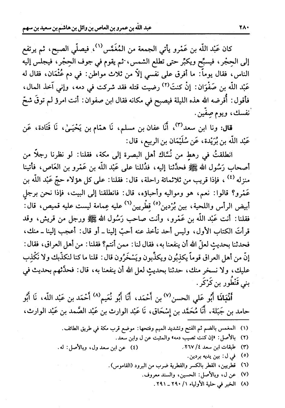 كان عبد الله بن عمرو يأتي الجمعة من المغمس (1) فيصلي الصبح ثم يرتفع إلى الحجر فيسبح ويكبر حتى تطلع الشمس ثم يقوم في جوف الحجر فيجلس إليه الناس فقال يوما ما أفرق على نفسي إلا من ثلاث مواطن في دم عثمان فقال له عبد الله بن صفوان إن كنت (2) رضيت قتله فقد شركت في دمه وإني آخذ المال فأقول أقرضه الله هذه الليلة فيصبح في مكانه فقال ابن صفوان أنت امرؤ لم توق شح نفسك ويوم صفين قال ونا ابن سعد (3) أنا عفان بن مسلم نا همام بن يحيى نا قتادة عن عبد الله بن بريدة عن سليمان بن الربيع قال انطلقت في رهط من نساك أهل البصرة إلى مكة فقلنا لو نظرنا رجلا من أصحاب رسول الله (صلى الله عليه وسلم) فحدثنا إليه فدللنا على عبد الله بن عمرو بن العاص فأتينا منزله (4) فإذا قريب من ثلاثمائة راحلة قال فقلنا على كل هؤلاء حج عبد الله بن عمرو قالوا نعم هو ومواليه وأحباؤه قال فانطلقنا إلى البيت فإذا نحن برجل أبيض الرأس واللحية بين بردين (5) قطريين (6) عليه عمامة ليست عليه قميص قال فقلنا أنت عبد الله بن عمرو وأنت صاحب رسول الله (صلى الله عليه وسلم) ورجل من قريش وقد قرأت الكتاب الأول وليس أحد نأخذ عنه أحب إلينا أو قال أعجب إلينا منك