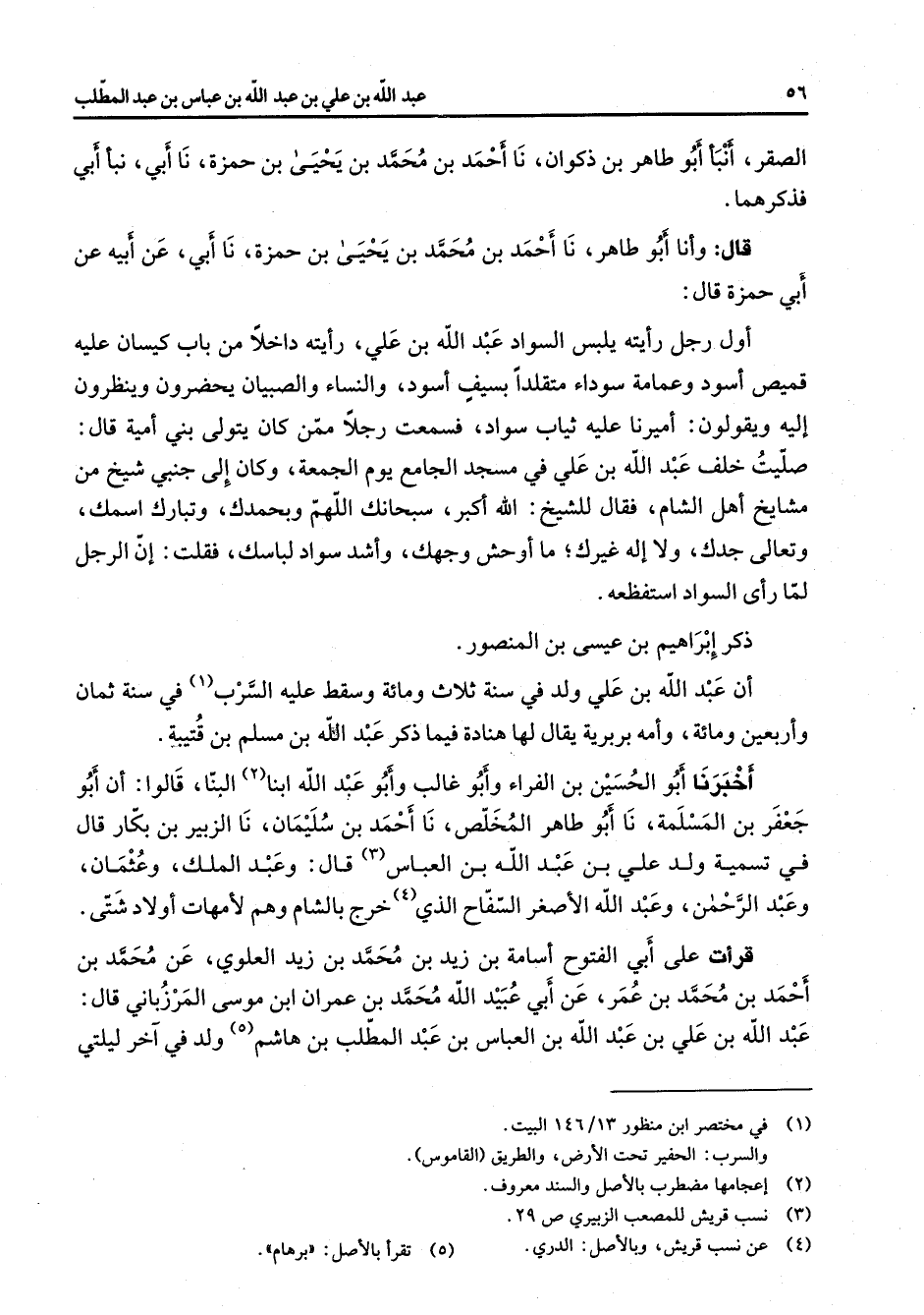 الصقر أنبأ أبو طاهر بن ذكوان نا أحمد بن محمد بن يحيى بن حمزة نا أبي نبأ أبي فذكرهما قال وأنا أبو طاهر نا أحمد بن محمد بن يحيى بن حمزة نا أبي عن أبيه عن أبي حمزة قال أول رجل رأيته يلبس السواد عبد الله بن علي رأيته داخلا من باب كيسان عليه قميص أسود وعمامة سوداء متقلدا بسيف أسود والنساء والصبيان يحضرون وينظرون إليه ويقولون أميرنا عليه ثياب سواد فسمعت رجلا ممن كان يتولى بني أمية قال صليت خلف عبد الله بن علي في مسجد الجامع يوم الجمعة وكان إلى جنبي شيخ من مشايخ أهل الشام فقال للشيخ الله أكبر سبحانك اللهم وبحمدك وتبارك اسمك وتعالى جدك ولا إله غيرك ما أوحش وجهك وأشد سواد لباسك فقلت إن الرجل لما راى السواد استفظعه ذكر أبراهيم بن عيسى بن المنصور أن عبد الله بن علي ولد في سنة ثلاث ومائة وسقط عليه السرب (1) في سنة ثمان وأربعين ومائة وأمه بربرية يقال لها هنادة فيما ذكر عبد الله بن مسلم بن قتيبة أخبرنا أبو الحسين بن الفراء وأبو غالب وأبو عبد الله ابنا (2) البنا قالوا أن أبو جعفر بن المسلمة نا أبو طاهر المخلص نا أحمد بن سليمان نا الزبير بن بكار قال في تسمية ولد علي بن عبد الله بن العباس (3) قال وعبد الملك وعثمان وعبد الرحمن وعبد الله الأصغر السفاح الذي (4) خرج بالشام وهم لأمهات لأولاد شتى قرأت على أبي الفتوح أسامة بن زيد بن محمد بن زيد العلوي عن محمد بن أحمد بن محمد بن عمر عن أبي عبيد الله محمد بن عمران ابن موسى المرزباني قال عبد الله بن علي بن عبد الله بن العباس بن عبد المطلب بن هاشم (5) ولد في آخر ليلتي