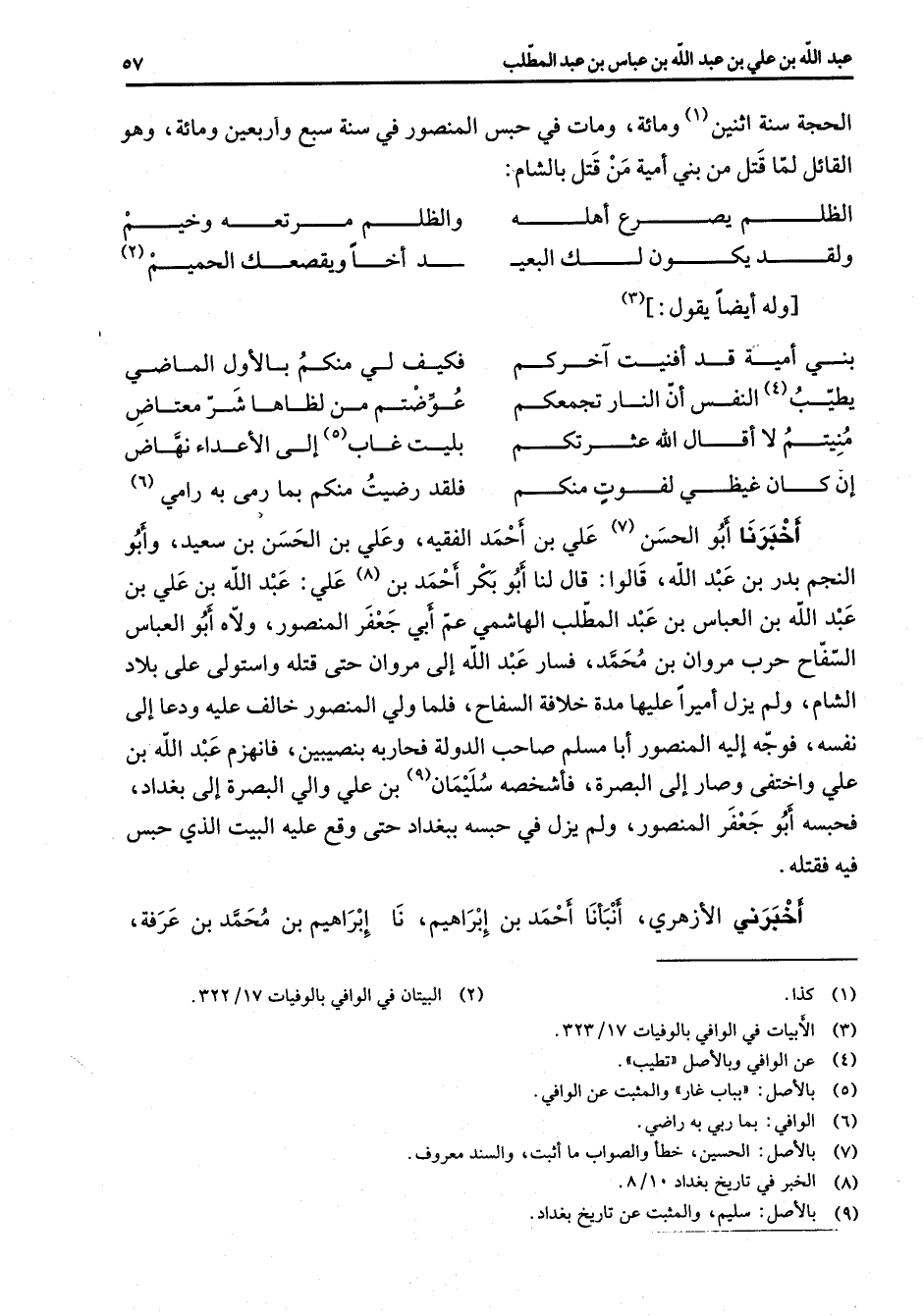 الحجة سنة اثنين (1) ومائة ومات في حبس المنصور في سنة سبع واربعين ومائة وهو القائل لما قتل من بني أمية من قتل بالشام * الظلم يصرع أهله * والظلم مرتعه وحيم ولقد يكون لك البعي * د أخا ويقصعك الحميم (2) * وله أيضا يقول (3) * بني امية قد أفنيت آخركم * فكيف لي منكم بالأول الماضي يطيب (4) النفس أن النار تجمعكم * عوضتم من لظاها شر معتاض منيتم لا أقال الله عثرتكم * بليت غاب (5) إلى الأعداء نهاض إن كان غيظي لفوت منكم * فلقد رضيت منكم بما رمى به رامي (6) * أخبرنا أبو الحسن (7) علي بن أحمد الفقيه وعلي بن الحسن بن سعيد وأبو النجم بدر بن عبد الله قالوا قال لنا أبو بكر أحمد بن (8) علي عبد الله بن علي بن عبد الله بن العباس بن عبد المطلب الهاشمي عم أبي جعفر المنصور ولاه أبو العباس السفاح حرب مروان بن محمد فسار عبد الله إلى مروان حتى قتله واستولى على بلاد الشام ولم يزل أميرا عليها مدة خلافة السفاح فلما ولي المنصور خالف عليه ودعا إلى نفسه فوجه إليه المنصور أبا مسلم صاحب الدولة فحاربه بنصيبين فانهزم عبد الله بن علي واختفى وصار إلى البصرة فأشخصه سليمان (9) بن علي والي البصرة إلى بغداد فحسبه أبو جعفر المنصور ولم يزل في حبسه ببغداد حتى وقع عليه البيت الذي حبس فيه فقتله أخبرني الأزهري أنبأنا أحمد بن إبراهيم نا إبراهيم بن محمد بن عرفة