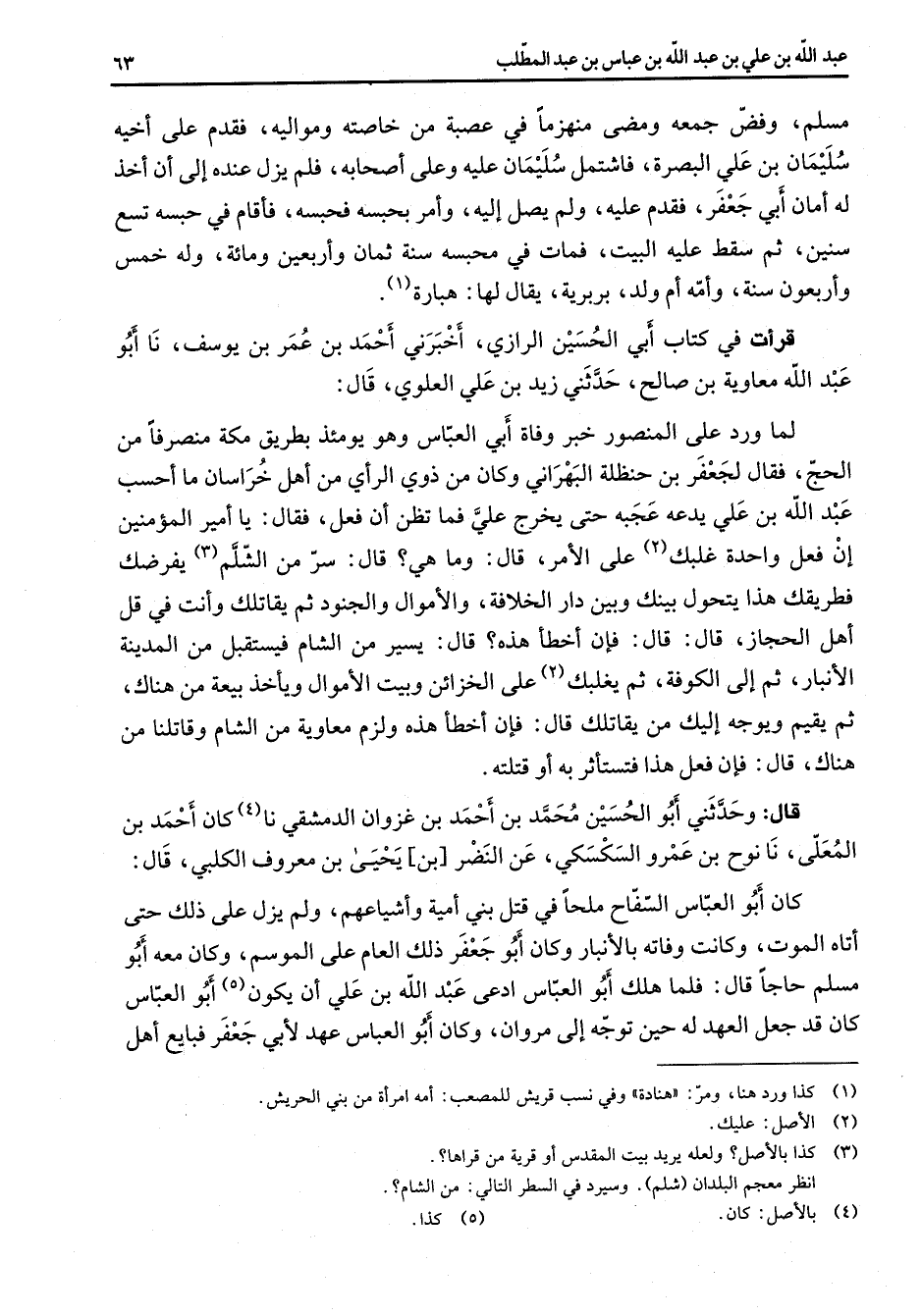 مسلم وفض جمعه ومضى منهزما في عصبة من خاصته ومواليه فقدم على أخيه سليمان بن علي البصرة فاشتمل سليمان عليه وعلى أصحابه فلم يزل عنده إلى أن أخذ له أمان أبي جعفر فقدم عليه ولم يصل إليه وأمر بحبسه فحبسه فأقام في حبسه تسع سنين ثم سقط عليه البيت فمات في محبسه سنة ثمان وأربعين ومائة وله خمس وأربعون سنة وأمه أم ولد بربرية يقال لها هبارة (1) قرأت في كتاب أبي الحسين الرازي أخبرني أحمد بن عمر بن يوسف نا أبو عبد الله معاوية بن صالح حدثني زيد بن علي العلوي قال لما ورد على المنصور خبر وفاة أبي العباس وهو يومئذ بطريق مكة منصرفا من الحج فقال لجعفر بن حنظلة البهراني وكان من ذوي الرأي من أهل خراسان ما أحسب عبد الله بن علي يدعه عجبه حتى يخرج علي فما تظن أن فعل فقال يا أمير المؤمنين إن فعل واحدة غلبك (2) على الأمر قال وما هي قال سر من الشلم (3) يفرضك فطريقك هذا يتحول بينك وبين دار الخلافة والأموال والجنود ثم يقاتلك وأنت في قل أهل الحجاز قال قال فإن أخطأ هذه قال يسير من الشام فيستقبل من المدينة الأنبار ثم إلى الكوفة ثم يغلبك (2) على الخزائن وبيت الأموال ويأخذ بيعة من هناك ثم يقيم ويوجه إليك من يقاتلك قال فإن أخطأ هذه ولزم معاوية من الشام وقاتلنا من هناك قال فإن فعل هذا فتستأثر به أو قتلته قال وحدثني أبو الحسين محمد بن أحمد بن غزوان الدمشقي نا (4) كان أحمد بن المعلى نا نوح ابن عمرو السكسكي عن النضر بن يحيى بن معروف الكلبي قال كان أبو العباس السفاح ملحا في قتل بني أمية وأشياعهم ولم يزل على ذلك حتى أتاه الموت وكانت وفاته بالأنبار وكان أبو جعفر ذلك العام على الموسم وكان معه أبو مسلم حاجا قال فلما هلك أبو العباس ادعى عبد الله بن علي أن يكون (5) أبو العباس كان قد جعل العهد له حين توجه إلى مروان وكان أبو العباس عهد لأبي جعفر فبايع أهل