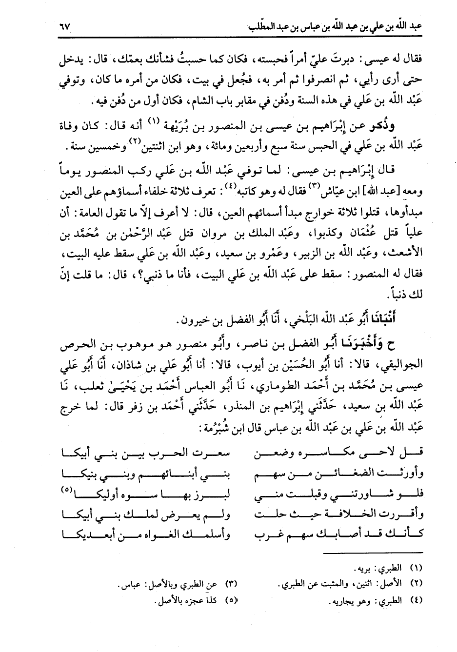 فقال له عيسى دبرت علي أمرا فحبسته فكان كما حسبت فشأنك بعمك قال يدخل حتى أرى رأيي ثم انصرفوا ثم أمر به فجعل في بيت فكان من أمره ما كان وتوفي عبد الله بن علي في هذه السنة ودفن في مقابر باب الشام فكان أول من دفن فيه وذكر عن إبراهيم بن عيسى بن المنصور بن بريهة (1) أنه قال كان وفاة عبد الله بن علي في الحبس سنة سبع وأربعين ومائة وهو ابن اثنتين (2) وخمسين سنة قال إبراهيم بن عيسى لما توفي عبد الله بن علي ركب المنصور يوما ومعه عبد الله بن عياش (3) فقال له وهو كاتبه (4) تعرف ثلاثة خلفاء أسماؤهم على العين مبدأوها قتلوا ثلاثة خوارج مبدأ أسمائهم العين قال لا أعرف إلا ما تقول العامة أن عليا قتل عثمان وكذبوا وعبد الملك بن مروان قتل عبد الرحمن بن محمد بن الأشعث وعبد الله بن الزبير وعمرو بن سعيد وعبد الله بن علي سقط عليه البيت فقال له المنصور سقط على عبد الله بن علي البيت فأنا ما ذنبي قال ما قلت إن لك ذنبا أنبأنا أبو عبد الله البلخي أنا أبو الفضل بن خيرون ح وأخبرنا أبو الفضل بن ناصر وأبو منصور هو موهوب بن الحرص الجواليقي قالا أنا أبو الحسين بن أيوب قالا أنا أبو علي بن شاذان أنا أبو علي عيسى بن محمد بن أحمد الطوماري نا أبو العباس أحمد بن يحيى ثعلب نا عبد الله بن سعيد حدثني إبراهيم بن المنذر حدثني أحمد بن زفر قال لما خرج عبد الله بن علي بن عبد الله بن عباس قال ابن شبرمة * قل لاحى مكاسره وضعن * سعرت الحرب بين بني أبيكا وأورثت الضعائن من سهم * بني أبنائهم وبني بنيكا فلو شاورتني وقبلت مني * لبرز بها سوه أوليكا (5) وأقررت الخلافة حيث حلت * ولم يعرض لملك بني أبيكا كأنك قد أصابك سهم غرب * وأسلمك الغواه من أبعديكا *