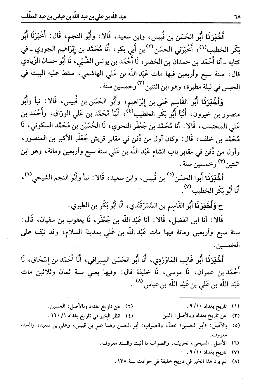 أخبرنا أبو الحسن بن قبيس وابن سعيد قالا وأبو النجم قال أخبرنا أبو بكر الخطيب (1) أخبرني الحسن (2) بن أبي بكر أنا محمد بن إبراهيم الجوري في كتابه أنا أحمد بن حمدان بن الخضر نا أحمد بن يونس الضبي نا أبو حسان الزيادي قال سنة سبع وأربعين فيها مات عبد الله بن علي الهاشمي سقط عليه البيت في الحبس ليلة مطيرة وهو ابن اثنتين (3) وخمسين سنة وأخبرنا أبو القاسم علي بن إبراهيم وأبو الحسن بن قبيس قالا نبأ وأبو منصور بن خيرون أنبأ أبو بكر الخطيب (4) أنبأ محمد بن علي الوراق وأحمد بن علي المحتسب قالا أنا محمد بن جعفر النحوي نا الحسين بن محمد السكوني نا محمد بن خلف قال وكان أول من دفن في مقابر قريش جعفر الأكبر بن المنصور وأول من دفن في مقابر باب الشام عبد الله بن علي سنة سبع وأربعين ومائة وهو ابن اثنتين (3) وخمسين سنة أخبرنا أبو الحسن (5) بن قبيس وابن سعيد قالا نبأ وأبو النجم الشيحي (6) أنا أبو بكر الخطيب (7) ح وأخبرنا أبو القاسم بن السمرقندي أنا أبو بكر بن الطبري قالا أنا ابن الفضل أنا عبد الله بن جعفر نا يعقوب بن سفيان قال سنة سبع وأربعين ومائة فيها مات عبد الله بن علي بمدينة السلام وقد نيف على الخمسين أخبرنا أبو غالب الماوردي أنا أبو الحسن السيرافي أنا أحمد بن إسحاق نا أحمد بن عمران نا موسى نا خليفة قال وفيها يعني سنة ثمان وثلاثين مات عبد الله بن علي بن عبد الله بن عباس (8)