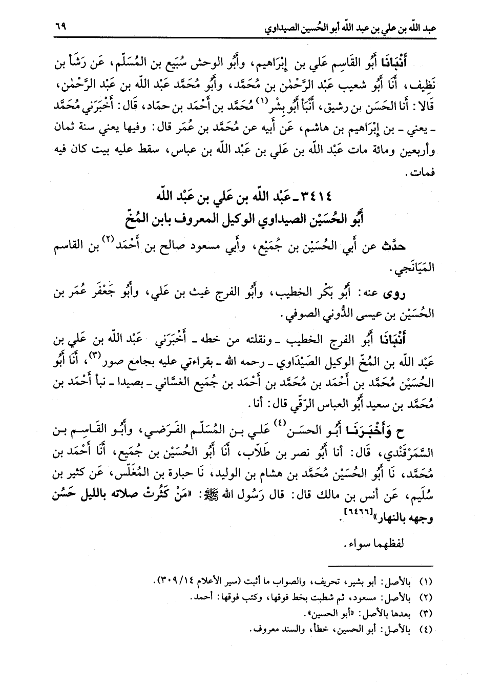 أنبأنا أبو القاسم علي بن إبراهيم وأبو الوحش سبيع بن المسلم عن رشأ بن نظيف أنا أبو شعيب بن عبد الرحمن بن محمد وأبو محمد عبد الله بن عبد الرحمن قالا أنا الحسن بن رشيق أنبأ أبو بشر (1) محمد بن أحمد بن حماد قال أخبرني محمد يعني بن إبراهيم بن هاشم عن أبيه عن محمد بن عمر قال وفيها يعني سنة ثمان وأربعين مات عبد الله بن علي بن عبد الله بن عباس سقط عليه بيت كان فيه فمات 3414 عبد الله بن علي بن عبد الله أبو الحسين الصيداوي الوكيل المعروف بابن المخ حدث عن أبي الحسين بن جميع وأبي مسعود صالح بن أحمد (2) بن القاسم الميانجي روى عنه أبو بكر الخطيب وأبو الفرج غيث بن علي وأبو جعفر عمر بن الحسين بن عيسى الدوني الصوفي أنبأنا أبو الفرج الخطيب ونقلته من خطه أخبرني عبد الله بن علي بن عبد الله بن المخ الوكيل الصيداوي رحمه الله بقراءتي عليه بجامع صور (3) أنا أبو الحسين محمد بن أحمد بن محمد بن أحمد بن جميع الغساني بصيدا نبأ أحمد بن محمد بن سعيد أبو العباس الرقي قال أنا ح وأخبرنا أبو الحسن (4) علي بن المسلم الفرضي وأبو القاسم بن السمرقندي قال أنا أبو نصر بن طلاب أنا أبو الحسين بن جميع أنا أحمد بن محمد نا أبو الحسين محمد بن هشام بن الوليد نا حبارة بن المغلس عن كثير بن سليم عن أنس بن مالك قال قال رسول الله (صلى الله عليه وسلم) من كثرت صلاته بالليل حسن وجهه بالنهار لفظهما سواء