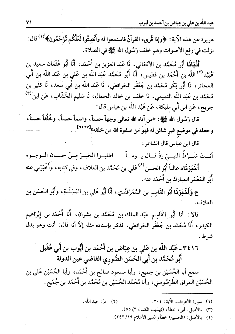 هريرة عن هذه الآية " وإذا قرئ القرآن فاستمعوا له وأنصتوا لعلكم ترحمون " (1) قال نزلت في رفع الأصوات وهم خلف رسول الله (صلى الله عليه وسلم) في الصلاة أنبأنا أبو محمد بن الأكفاني نا عبد العزيز بن أحمد أنا أبو عثمان سعيد بن عبيد (2) الله بن أحمد بن فطيس أنا أبو محمد عبد الله بن علي بن عبد الله بن أبي العجائز نا أبو بكر محمد بن جعفر الخرائطي نا عبد الله بن أبي سعد نا كثير بن محمد بن عبد الله التميمي نا خلف بن خالد الحمال نا سليم الخشاب عن ابن (3) جريج عن ابن أبي مليكة عن عبد الله بن عباس قال قال رسول الله (صلى الله عليه وسلم) من آتاه الله تعالى وجها حسنا واسما حسنا وخلقا حسنا وجعله في موضع غير شائن له فهو من صفوة الله من خلقه قال ابن عباس قال الشاعر * أنت شرط النبي إذا قال يوما * اطلبوا الخير من حسان الوجوه * أخبرناه عاليا أبو الحسن (4) علي بن محمد بن العلاف وفي كتابه وأخبرني عنه أبو المعمر المبارك بن أحمد عنه ح وأخبرنا أبو القاسم بن السمرقندي أنا أبو علي بن المسلمة وأبو الحسن بن العلاف قالا أنا أبو القاسم عبد الملك بن محمد بن بشران أنا أحمد بن إبراهيم الكيدر أنا محمد بن جعفر الخرائطي فذكر بإسناده مثله إلا أنه قال أنت وهو بدل شرط