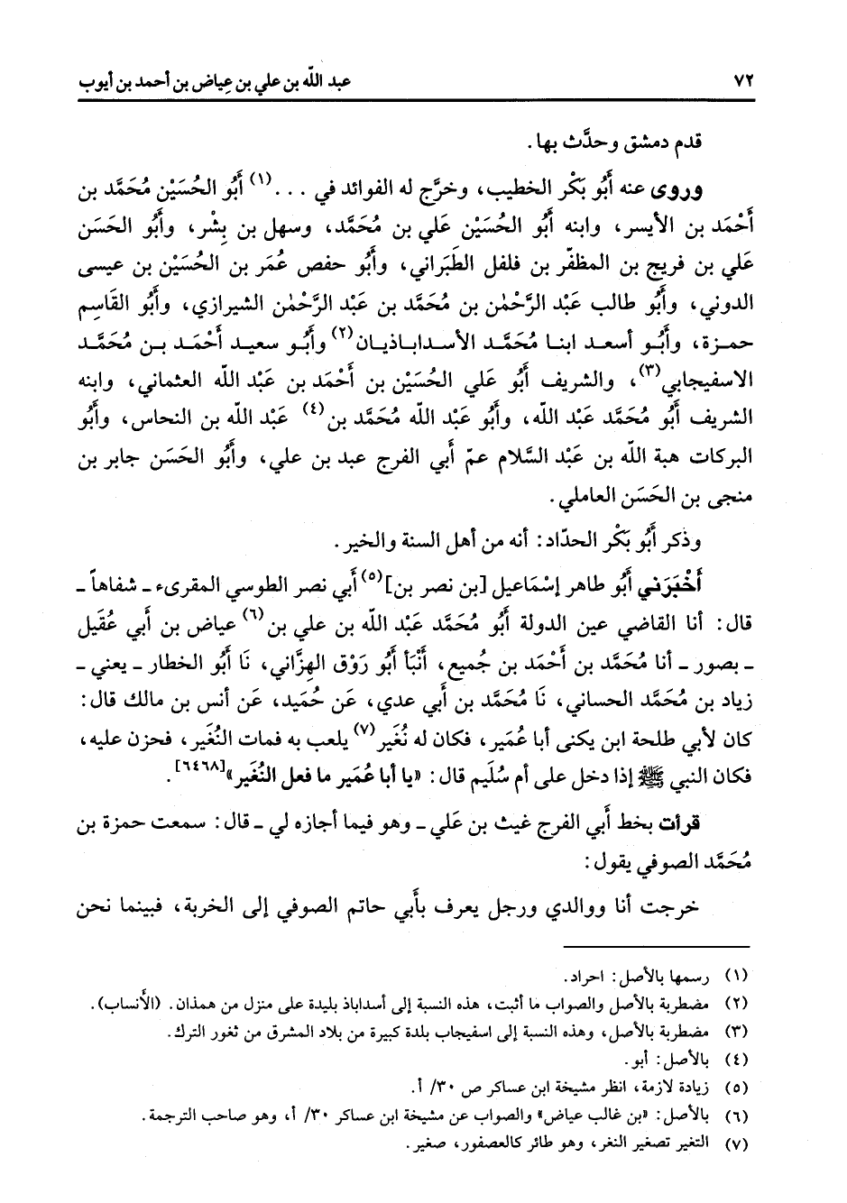 قدم دمشق وحدث بها وروى عنه أبو بكر الخطيب وخرج له الفوائد في (1) أبو الحسين محمد بن أحمد بن الأيسر وابنه أبو الحسين علي بن محمد وسهل بن بشر وأبو الحسن علي بن فريج بن المظفر بن فلفل الطبراني وأبو حفص عمر بن الحسين بن عيسى الدوني وأبو طالب عبد الرحمن بن محمد بن عبد الرحمن الشيرازي وأبو القاسم حمزة وأبو أسعد ابنا محمد الأسداباذيان (2) وأبو سعيد أحمد بن محمد الإسفيجابي (3) والشريف أبو علي الحسين بن أحمد بن عبد الله العثماني وابنه الشريف أبو محمد عبد الله وأبو عبد الله محمد بن (4) عبد الله بن النحاس وابو البركات هبة الله بن عبد السلام عم أبي الفرج عبد بن علي وأبو الحسن جابر بن منجي بن الحسن العاملي وذكر أبو بكر الحداد أنه من أهل السنة والخير أخبرني أبو طاهر إسماعيل بن نصر بن (5) أبي نصر الطوسي المقرئ شفاها قال أنا القاضي عين الدولة أبو محمد عبد الله بن علي بن (6) عياض بن أبي عقيل بصور أنا محمد بن أحمد بن جميع أنبأ أبو روق الهزاني نا أبو الخطار يعني زياد بن محمد الحساني نا محمد بن أبي عدي عن حميد عن أنس بن مالك قال كان لأبي طلحة ابن يكنى أبا عمير فكان له نغير (7) يلعب به فمات النغير فحزن عليه فكان النبي (صلى الله عليه وسلم) إذا دخل على أم سليم قال يا أبا عمير ما فعل النغير قرأت بخط أبي الفرج غيث بن علي وهو فيما أجازه لي قال سمعت حمزة بن محمد الصوفي يقول خرجت أنا ووالدي ورجل يعرف بأبي حاتم الصوفي إلى الخربة فبينما نحن