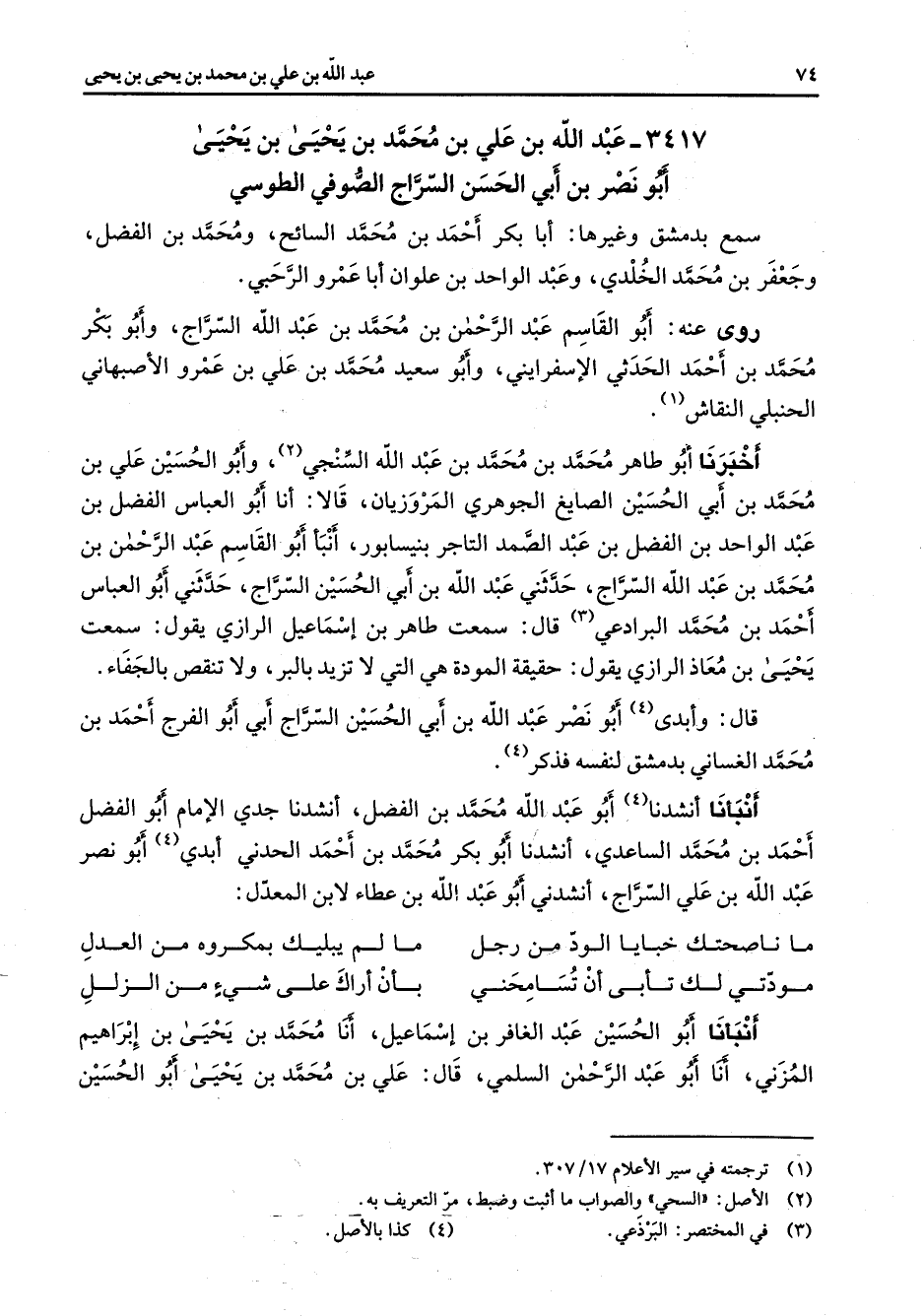 3417 - عبد الله بن علي بن محمد بن يحيى بن يحيى أبو نصر بن أبي الحسن السراج الصوفي الطوسي سمع بدمشق وغيرها أبا بكر أحمد بن محمد السائح ومحمد بن الفضل وجعفر بن محمد الخلدي وعبد الواحد بن علوان أبا عمرو الرحبي روى عنه أبو القاسم عبد الرحمن بن محمد بن عبد الله السراج وأبو بكر محمد بن أحمد الحدثي الإسفرايني وابو سعيد محمد بن علي بن عمرو الأصبهاني الحنبلي النقاش (1) أخبرنا أبو طاهر محمد بن محمد بن عبد الله السنجي (2) وأبو الحسين علي بن محمد بن أبي الحسين الصايغ الجوهري المروزيان قالا أنا أبو العباس الفضل بن عبد الواحد بن الفضل بن عبد الصمد التاجر بنيسابور أنبأ أبو القاسم عبد الرحمن بن محمد بن عبد الله السراج حدثني عبد الله بن أبي الحسين السراج حدثني أبو العباس أحمد بن محمد البرادعي (3) قال سمعت طاهر بن إسماعيل الرازي يقول سمعت يحيى بن معاذ الرازي يقول حقيقة المودة هي التي لا تزيد بالبر ولا تنقص بالجفاء قال وأبدي (4) أبو نصر عبد الله بن أبي الحسين السراج أبي أبو الفرج أحمد بن محمد الغساني بدمشق لنفسه فذكر (4) أنشدنا (4) أبو عبد الله محمد بن الفضل أنشدنا جدي الإمام أبو الفضل أحمد بن محمد الساعدي أنشدنا أبو بكر محمد بن أحمد الحدني أبدي (4) أبو نصر عبد الله بن علي السراج أنشدني أبو عبد الله بن عطاء لابن المعدل * ما ناصحتك خبايا الود من رجل * ما لم يبليك بمكروه من العدل مودتي لك تأبى أن تسامحني * بأن أراك على شئ من الزلل * أنبأنا أبو الحسين عبد الغافر بن إسماعيل أنا محمد بن يحيى بن إبراهيم المزني أنا أبو عبد الرحمن السلمي قال علي بن محمد بن يحيى أبو الحسين