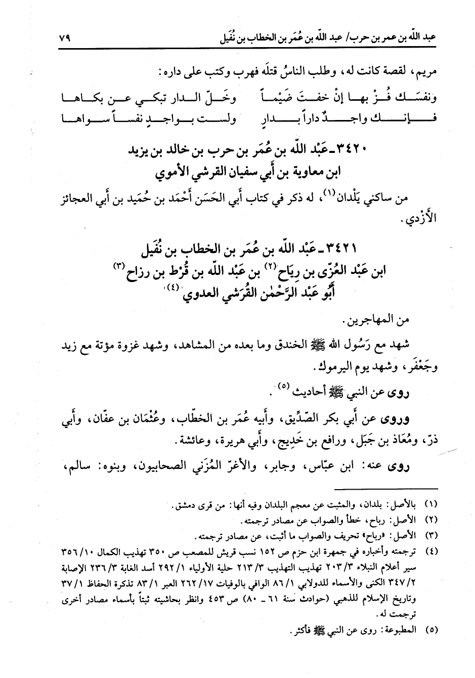 3421 - عبد الله بن عمر بن الخطاب بن نفيل بن عبد العزى بن رياح (2) بن عبد الله بن قرط بن رزاح (3) أبو عبد الرحمن القرشي العدوي (4) من المهاجرين شهد مع رسول الله (صلى الله عليه وسلم) الخندق وما بعده من المشاهد وشهد غزوة مؤتة مع زيد وجعفر وشهد يوم اليرموك روى عن النبي (صلى الله عليه وسلم) أحاديث (5) وروى عن أبي بكر الصديق وأبيه عمر بن الخطاب وعثمان بن عفان وأبي ذر ومعاذ بن جبل ورافع بن خديج وأبي هريرة وعائشة روى عنه ابن عباس وجابر والأغر المزني الصحابيون وبنوه سالم