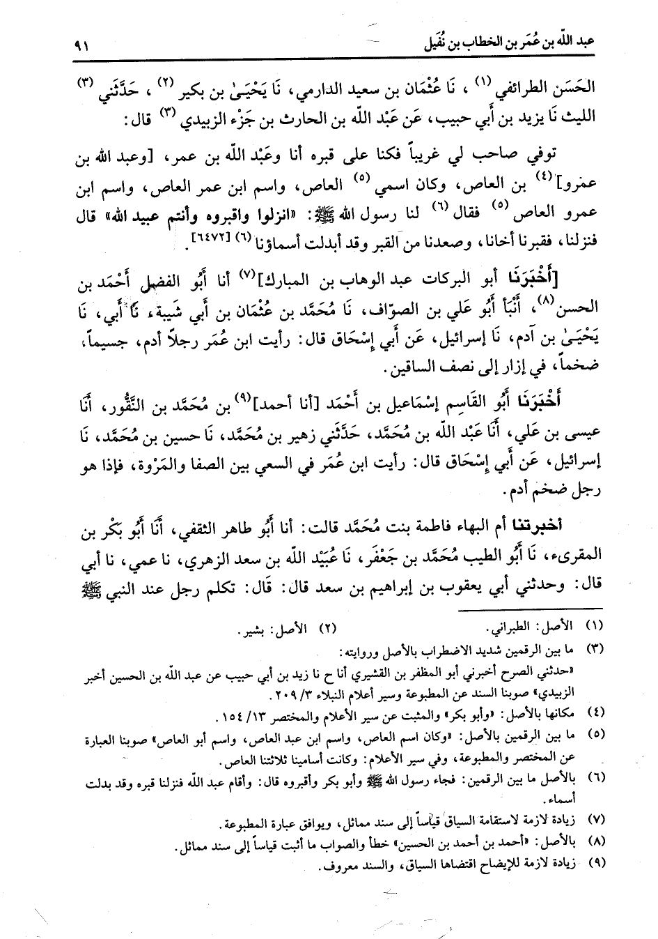 الحسن الطرائفي (1) نا عثمان بن سعيد الدارمي نا يحيى بن بكير (2) حدثني (3) الليث نا يزيد بن أبي حبيب عن عبد الله بن الحارث بن جزء الزبيدي (3) قال توفي صاحب لي غريبا فكنا على قبره أنا وعبد الله بن عمرو (4) بن العاص وكان اسمي (5) العاص واسم عمر العاص واسم ابن عمرو العاص (5) فقال (6) لنا رسول الله (صلى الله عليه وسلم) أنزلوا واقبروه وأنتم عبيد الله قال فنزلنا فقبرنا أخانا وصعدنا من القب وقد أبدلت أسماؤنا (6) أخبرنا أبو البركات عبد الوهاب بن المبارك (7) أنا أبو الفضل أحمد بن الحسن (8) أنبأ أبو علي بن الصواف نا محمد بن عثمان بن أبي شيبة نا أبي نا يحيى بن آدم نا إسرائيل عن أبي إسحاق قال رأيت ابن عمر رجلا أدم سمينا ضخما في إزار إلى نصف الساقين أخبرنا أبو القاسم إسماعيل بن أحمد أنا أحمد (9) بن محمد بن النقور أنا عيسى بن علي أنا عبد الله بن محمد نا الحسين بن محمد حدثني زهير بن محمد نا حسين بن محمد نا إسرائيل عن أبي إسحاق قال رأيت ابن عمر بين الصفا والمروة فإذا هو رجل ضخم أدم أخبرتنا أم البهاء فاطمة بنت محمد قالت أنا أبو طاهر الثقفي أنا أبو بكر المقرئ نا أبو الطيب محمد بن جعفر نا عبيد الله بن سعد الزهري نا عمي نا أبي قال حدثني أبو يعقوب بن إبراهيم بن سعد قال قال تكلم رجل عند النبي (صلى الله عليه وسلم)