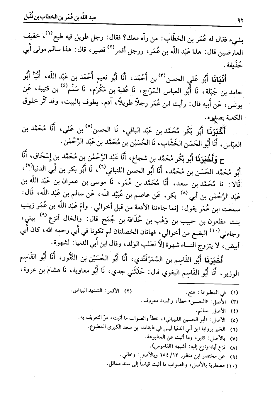 بشئ فقال له عمر بن الخطاب من رآه معك فقال رجل طويل فيه طبع (1) خفيف العارضين قال هذا عبد الله بن عمر ورجل أقمر (2) قصير قال هذا سالم مولى أبي حذيفة أنبأنا أبو عليي الحسن (3) بن أحمد أنا أبو نعيم أحمد بن عبد الله أنبأ أبو حامد بن جبلة نا أبو العباس السراج نا عقبة بن مكرم نا سلم (4) بن قتيبة عن يونس عن أبيه قال رأيت ابن عمر رجلا طويلا آدم يطوف بالبيت وقد أثر خلوق الكعبة بصدره أخبرنا أبو بكر محمد بن عبد الباقي نا الحسن (5) بن علي أنا محمد بن العباس أنا أبو الحسن الخشاب نا الحسين بن محمد بن عبد الرحمن ح وأخبرنا أبو بكر محمد بن شجاع أنا عبد الرحمن بن محمد بن إسحاق أنا أبو محمد الحسن بن محمد أنا أبو الحسن اللنباني (6) نا أبو بكر بن أبي الدنيا (7) قالا نا محمد بن سعد أنا محمد بن عمر نا موسى بن عمران بن عبد الله بن عبد الرحمن بن أبي (8) بكر عن عاصم بن عبيد الله عن سالم بن عبد الله قال سمعت ابن عمر يقول إنما جاءتنا الأدمة من قبل أخوالي وأم عبد الله بن عمر زينب بنت مظعون بن حبيب بن وهب بن حذافة بن جمح قال والخال أنزع (9) بيني وجاءني (10) البضع من أخوالي فهاتان الخصلتان لم تكونا في أبي رحمه الله كان أبي أبيض لا يتزوج النساء شهوة إلا لطلب الولد وقال ابن أبي الدنيا لشهوة أخبرنا أبو القاسم بن السمرقندي أنا أبو الحسين بن النقور أنا أبو القاسم الوزير أنا أبو القاسم البغوي قال حدثني جدي نا أبو معاوية نا هشام بن عروة