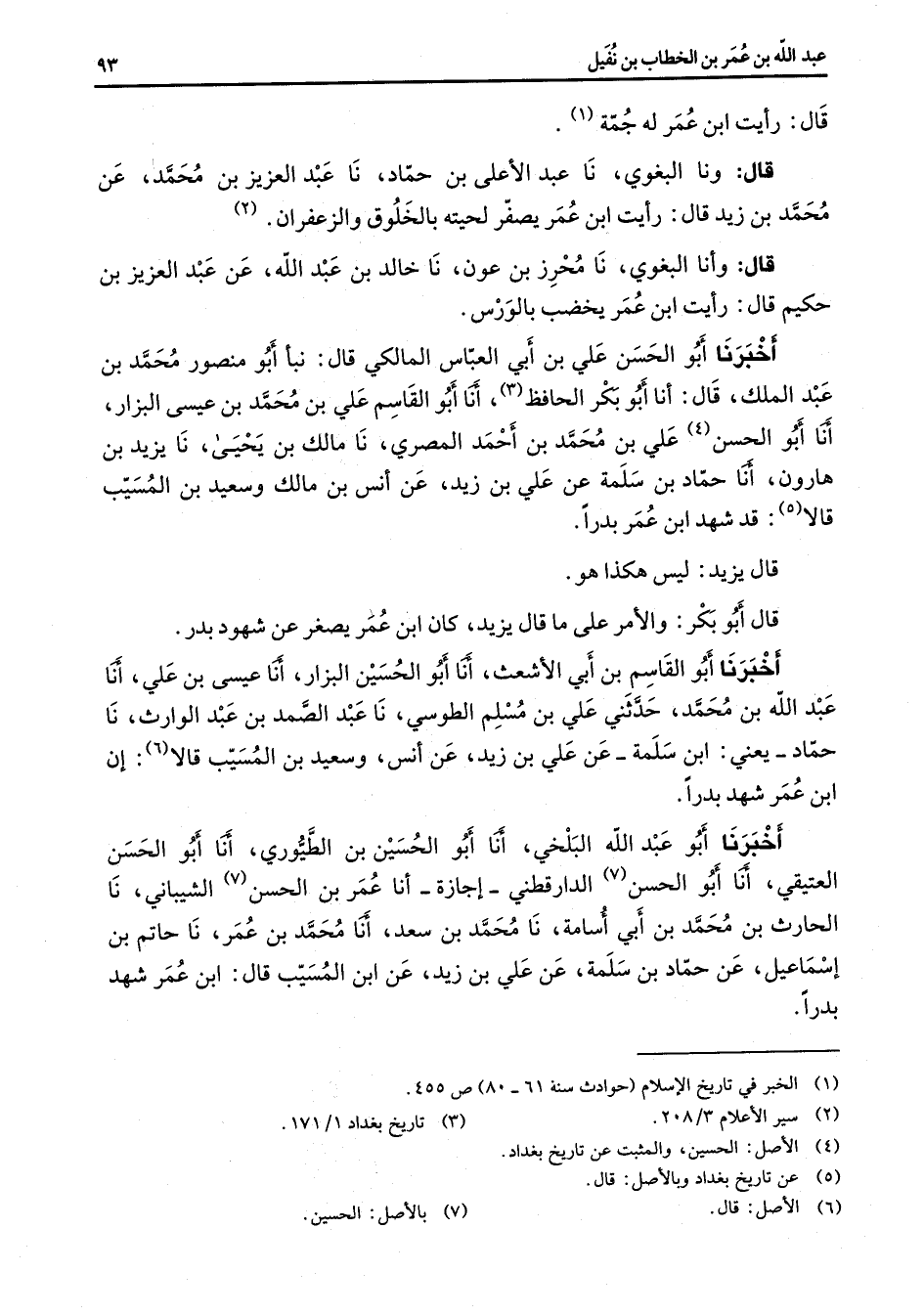 قال رأيت ابن عمر له جمة (1) قال ونا البغوي نا عبد الأعلى بن حماد نا عبد العزيز بن محمد عن محمد بن زيد قال رايت ابن عمر يصفر لحيته بالخلوق والزعفران (2) قال وأنا البغوي نا محرز بن عون نا خالد بن عبد الله عن عبد العزيز بن حكيم قال رأيت ابن عمر يخضب بالورس أخبرنا أبو الحسن علي بن ابي العباس المالكي قال نبأ أبو منصور محمد بن عبد الملك قال أنا أبو بكر الحافظ (3) أنا أبو القاسم علي بن محمد بن عيسى البزار أنا أبو الحسن (4) علي بن محمد بن أحمد المصري نا مالك بن يحيى نا يزيد بن هارون أنا حماد بن سلمة عن علي بن زيد عن أنس بن مالك وسعيد بن المسيب قالا (5) قد شهد ابن عمر بدرا قال يزيد ليس هكذا هو قال أبو بكر والأمر على ما قال يزيد كان ابن عمر يصغر عن شهود بدر أخبرنا أبو القاسم بن أبي الأشعث أنا أبو الحسين البزار أنا عيسى بن علي أنا عبد الله بن محمد حدثني علي بن مسلم الطوسي نا عبد الصمد بن عبد الوارث نا حماد يعني ابن سلمة عن علي بن زيد عن أنس وسعيد بن المسيب قالا (6) إن ابن عمر شهد بدرا أخبرنا أبو عبد الله البلخي أنا أبو الحسين الطيوري أنا أبو الحسن العتيقي أنا أبو الحسن (7) الدارقطني إجازة أنا عمر بن الحسن (7) الشيباني نا الحارث بن محمد بن أبي أسامة نا محمد بن سعد أنا محمد بن عمر نا حاتم بن إسماعيل عن حماد بن سلمة عن علي بن زيد عن ابن المسيب قال ابن عمر شهد بدرا