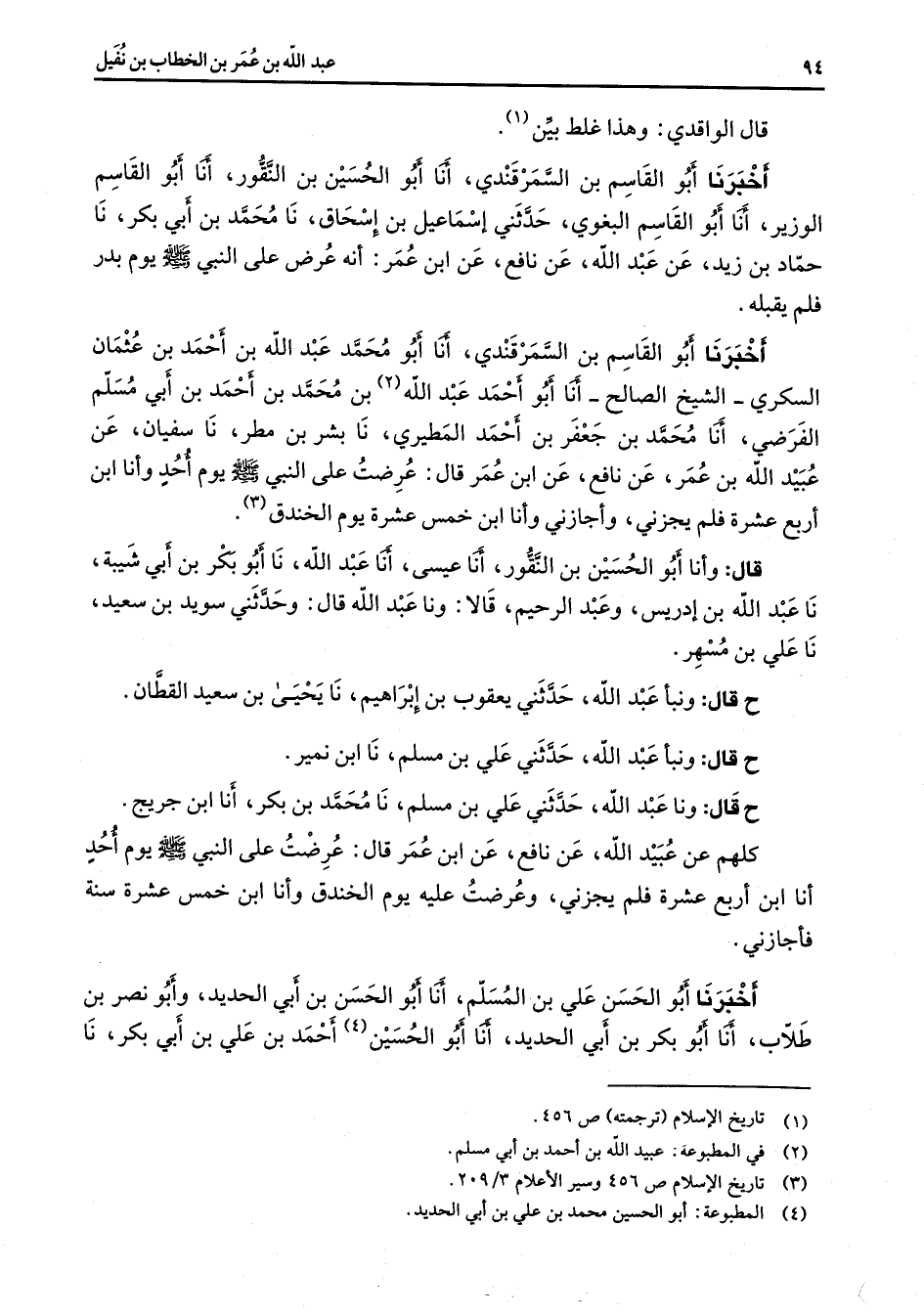 قال الواقدي وهذا غلط بين (1) أخبرنا أبو القاسم بن السمرقندي أنا أبو الحسين بن النقور أنا أبو القاسم الوزير أنا أبو القاسم البغوي حدثني إسماعيل بن إسحاق نا محمد بن أبي بكر نا حماد بن زيد عن عبد الله عن نافع عن ابن عمر أنه عرض على النبي (صلى الله عليه وسلم) يوم بدر فلم يقبله أخبرنا أبو القاسم بن السمرقندي أنا محمد بن عبد الله بن أحمد بن عثمان السكري الشيخ الصالح أنا أبو أحمد عبد الله (2) بن محمد بن أحمد بن أبي مسلم الفرضي أنا محمد بن جعفر بن أحمد المطيري نا بشر بن مطر نا سفيان عن عبيد الله بن عمر عن نافع عن ابن عمر قال عرضت على النبي (صلى الله عليه وسلم) يوم أحد وأنا ابن أربع عشرة فلم يجزني وأجازني وأنا ابن خمس عشرة يوم الخندق (3) قال وأنا أبو الحسين بن النقور أنا عيسى أنا عبد الله نا أبو بكر بن أبي شيبة نا عبد الله بن أدريس وعبد الرحيم قالا ونا عبد الله قال وحدثني سويد بن سعيد نا علي بن مسهر ح قال ونبأ عبد الله حدثني يعقوب بن إبراهيم نا يحيى بن سعيد القطان ح قال ونبأ عبد الله حدثني علي بن مسلم نا ابن نمير ح قال ونا عبد الله حدثني علي بن مسلم نا محمد بن بكر أنا ابن جريج كلهم عن عبيد الله عن نافع عن ابن عمر عرضت على النبي (صلى الله عليه وسلم) يوم أحد أنا ابن أربع عشرة فلم يجزني وعرضت عليه يوم الخندق وأنا ابن خمس عشرة سنة فأجازني أخبرنا أبو الحسن علي بن المسلم أنا أبو الحسن بن أبي الحديد وأبو نصر بن طلاب أنا أبو بكر بن أبي الحديد أنا أبو الحسين (4) أحمد بن علي بن ابي بكر نا