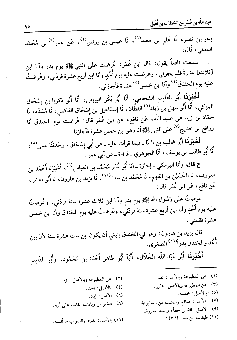 بحر بن نصر نا علي بن معبد (1) نا عيسى بن يونس (2) عن عمر (3) بن محمد المدني قال سمعت نافعا يقول قال ابن عمر عرضت على النبي (صلى الله عليه وسلم) يوم بدر وأنا ابن ثلاث عشرة فلم يجزني وعرضت عليه يوم أحد وأنا ابن أربع عشرة فردني وعرضت عليه يوم الخندق (4) وأنا ابن خمس - 5) عشرة فأجازني أخبرنا أبو القاسم الشحامي أنا أبو بكر البيهقي أنا أبو ذكريا بن إسحاق المزكي أنا أبو سهل بن زياد (6) القطان نا إسماعيل بن إسحاق القاضي نا مسدد نا حماد بن زيد عن عبيد الله عن نافع عن ابن عمر قال عرضت يوم الخندق أنا ورافع بن خديج (7) على النبي (صلى الله عليه وسلم) أنا وهو ابن خمس عشرة فأجازنا أخبرنا أبو غالب بن البنا فيما قرأت عليه عن أبي إسحاق وحدثنا عمي (8) أنا أبو طالب بنيوسف أنا الجوهري قراءة عن أبي عمر ح قال وأنا البرمكي إجازة أنا أبو عمر محمد بن العباس (9) أخبرنا أحمد بن معروف نا الحسين بن الفهم نا محمد بن سعد (10) نا يزيد بن هارون نا أبو معشر عن نافع عن ابن عمر قال عرضت على رسول الله (صلى الله عليه وسلم) يوم بدر وأنا ابن ثلاث عشرة سنة فردني وعرضت عليه يوم أحد وأنا ابن أربع عشرة سنة فردني وعرضت عليه يوم الخندق وأنا ابن خمس عشرة فقبلني قال يزيد بن هارون وهو في الخندق ينبغي أن يكون ابن ست عشرة سنة لأن بين أحد والخندق بدرا (11) الصغرى أخبرنا أبو عبد الله الخلال أنبأ أبو طاهر أحمد بن محمود وأبو القاسم