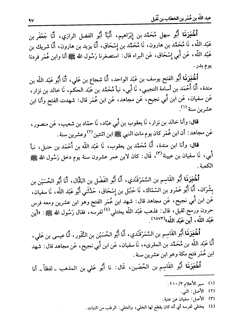 أخبرنا أبو سهل محمد بن إبراهيم أنبأ أبو الفضل الرازي أنا جعفر بن عبد الله نا محمد بن هارون نا محمد بن إسحاق أنا يزيد بن هارون أنا شريك بن عبد الله عن أبي إسحاق عن البراء قال استصغرنا رسول الله (صلى الله عليه وسلم) أنا وابن عمر فردنا يوم بدر أخبرنا أبو الفتح يوسف بن عبد الواحد أنا شجاع بن بن علي أنا أبو عبد الله بن مندة أنا أحمد بن أسامة التجيبي نا أبي نبأ محمد بن عبد الحكم نا خالد بن نزار عن سفيان عن ابن أبي نجيح عن مجاهد عن ابن عمر قال شهدت الفتح وأنا ابن عشرين سنة (1) قال وأنا خالد بن نزار نا يعقوب بن أبي عباد نا حماد بن شعيب عن منصور عن مجاهد أن ابن عمر كان يوم مات النبي (صلى الله عليه وسلم) ابن اثنتين (2) وعشرين سنة قال وأنا ابن مندة أنا محمد بن يعقوب نا عبد الله بن أحمد بن حنبل نبأ أبي نا سفيان بن عيينة (3) قال كان لابن عمر عشرون سنة يوم دخل رسول الله (صلى الله عليه وسلم) الكعبة أخبرنا أبو القاسم بن السمرقندي أنا أبو الفضل بن البقال أنا أبو الحسين بن بشران أنا أبو عمر بن السماك نا حنبل بن إسحاق حدثني أبو عبد الله نا سفيان عن ابن أبي نجيح عن مجاهد قال شهد ابن عمر الفتح وهو ابن عشرين ومعه فرس حرون ورمح ثقيل قال فذهب عبد الله يختلي (4) لفرسه فقال رسول الله (صلى الله عليه وسلم) أين عبد الله أين عبد الله أخبرنا أبو القاسم بن السمرقندي أنا أبو الحسين بن النقور أنا عيسى بن علي أنا عبد الله بن محمد بن المقرئ نا سفيان عن ابن أبي نجيح عن مجاهد قال شهد ابن عمر فتح مكة وهو ابن عشرين سنة أخبرنا أبو القاسم بن الحصين قال نا أبو علي بن المذهب لفظا أنا