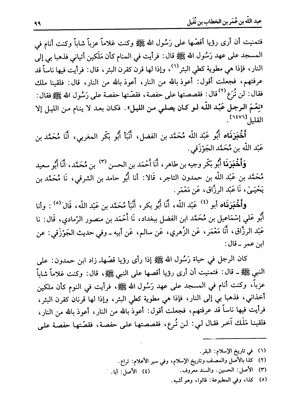 فتمنيت أن أرى رؤيا أقصها على رسول الله (صلى الله عليه وسلم) وكنت غلاما عزبا شابا وكنت أنام في المسجد على عهد رسول الله (صلى الله عليه وسلم) قال فرأيت في المنام كأن ملكين أتيا فذهبا بي إلى النار فإذا هي مطوية كطي البئر (1) وإذا لها قرون قرن البئر قال فرأيت فيها ناسا قد عرفتهم فجعلت أقول أعوذ بالله من النار أعوذ بالله من النار قال فلقينا ملك فقال لن ترع (2) قال فقصصتها على حفصة فقصتها حفصة على رسول الله (صلى الله عليه وسلم) فقال نعم الرجل عبد الله لو كان يصلي من الليل فكان بعد لا ينام من الليل إلا القليل أخبرناه أبو عبد الله محمد بن الفضل أنبأ أبو بكر المغربي أنا محمد بن عبد الله بن محمد الجوزقي وأخبرنا أبو بكر وجيه بن طاهر أنا أحمد بن الحسن (3) بن محمد أنا أبو سعيد محمد بن عبد الله بن حمدون التاجر قالا أنا أبو حامد بن الشرقي نا محمد بن يحيى نا عبد الرزاق عن معمر وأخبرناه أبو (4) عبد الله أنا أبو بكر أنبأ محمد بن عبد الله قال (5) وانا أبو علي إسماعيل بن محمد بن الفضل ببغداد نا أحمد بن منصور الرمادي قال نا عبد الرزاق أنا معمر عن الزهري عن سالم عن أبيه وفي حديث الجوزقي عن ابن عمر قال كان الرجل في حياة رسول الله (صلى الله عليه وسلم) إذا رأى رؤيا قصها زاد ابن حمدون على النبي (صلى الله عليه وسلم) قال فتمنيت أن أرى رؤيا أقصها على النبي (صلى الله عليه وسلم) قال وكنت غلاما شابا عزبا وكنت أنام في المسجد على عهد رسول الله (صلى الله عليه وسلم) فرأيت في النوم كأن ملكين أخذاني فذهبا بي إلى النار فإذا هي مطوية كطي البئر وإذا لها قرن كقرنان البئر فرأيت فيها ناسا قد عرفتهم فجعلت أقول أعوذ بالله من النار أعوذ بالله من النار فلقينا ملك آخر فقال لي لن ترع فقصصتها على حفصة فقصتها حفصة على