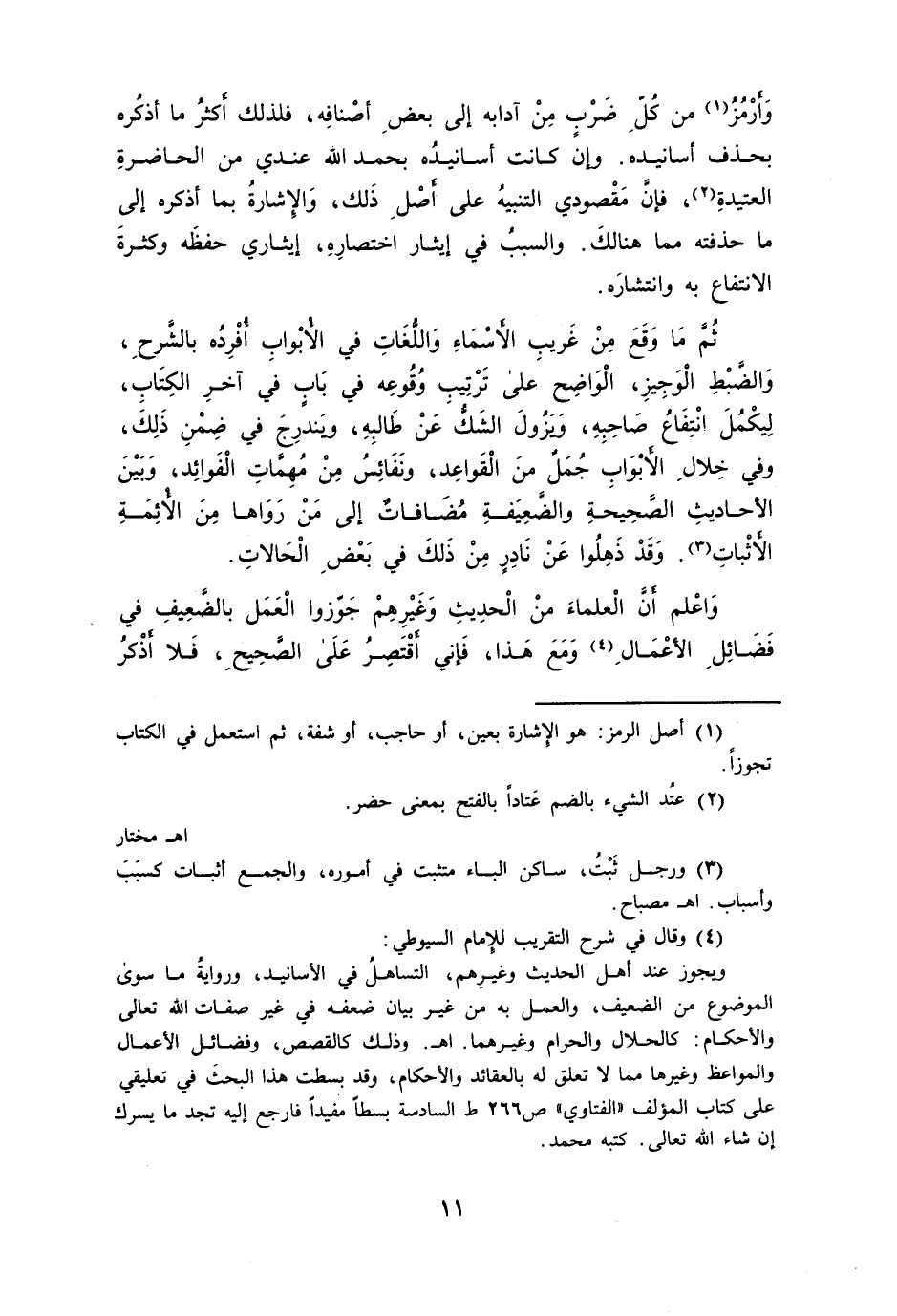 وأعلم أن العلماء من الحديث وغيرهم جوزوا العمل بالضعيف في فضائل الأعمال (4) ومع هذا، فإني أقتصر على الصحيح، فلا أذكر