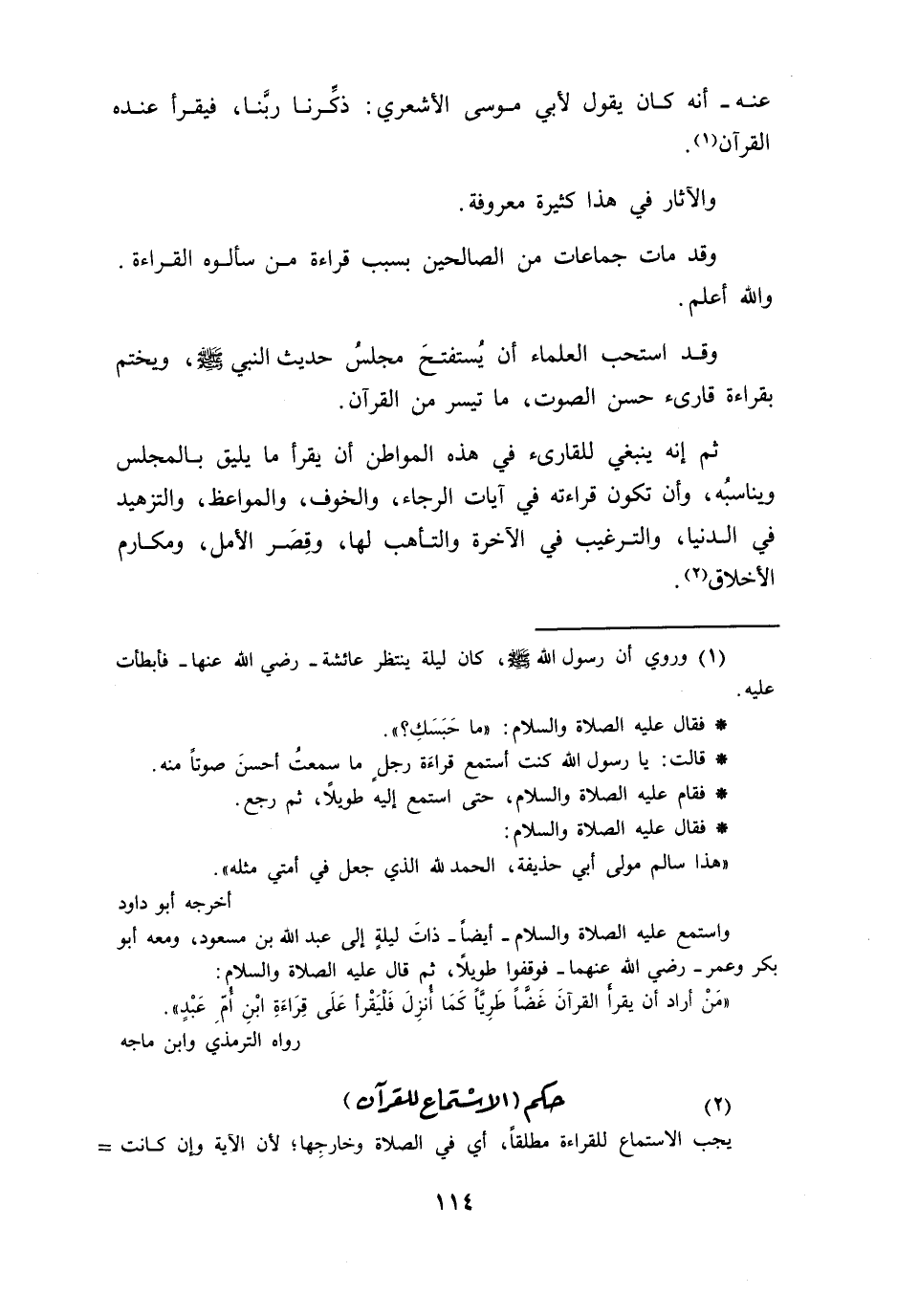 عنه انه كان يقول لأبي موسى الأشعري ذكرنا ربنا فيقرأ عنده القرآن والآثار في هذا كثيرة معروفة وقد مات جماعات من الصالحين بسبب قراءة من سألوه القراءة والله أعلم وقد استحب العلماء أن يستفتح مجلس حديث النبي صلى الله عليه وسلم: ويختم بقراءة قارئ حسن الصوت ما تيسر من القرآن ثم إنه ينبغي للقارئ في هذه المواطن ان يقرأ ما يليق بالمجلس ويناسبه وأن تكون قراءته في آيات الرجاء والخوف والمواعظ والتزهيد في الدنيا والترغيب في الآخرة والتأهيب لها وقصر الامل ومكارم الأخلاق