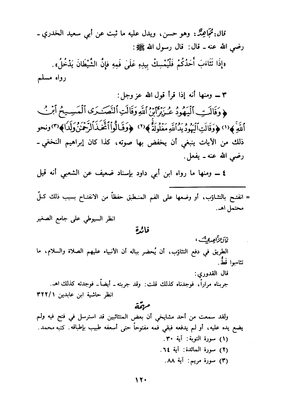 قال مجاهد وهو حسن ويدل عليه ما ثبت عن أبي سعيد الخدري رضي الله عنه قال قال رسول الله صلى الله عليه وسلم: إذا تثاءب أحدكم فليمسك بيده على فمه فإن الشيطان يدخل رواه مسلم 3 - ومنها أنه إذا قرأ قول الله عز وجل (وقال اليهود عزير ابن الله وقالت النصارى المسيح ابن الله وقالت اليهود يد الله مغلولة وقالوا اتخذ الرحمن ولدا ونحو ذلك من الآيات ينبغي أن يخفض بها صوته كذا كان إبراهيم النخعي رضي الله عنه يفعل 4 - ومنها ما رواه ابن أبي داود باسناد ضعيف عن الشعبي أنه قيل