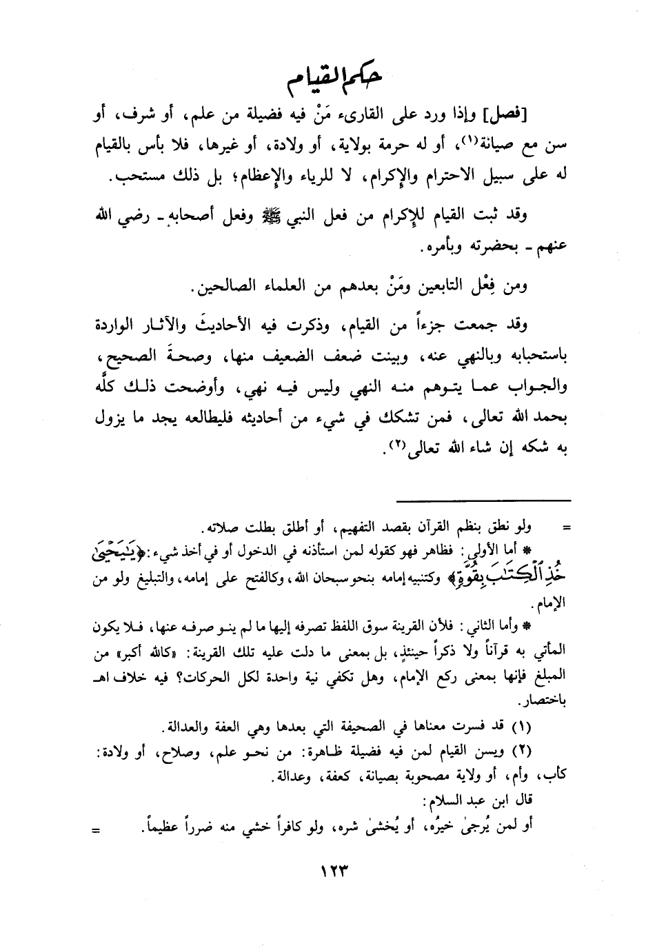 [فصل] وإذا ورد على القارئ من فيه فضيلة من علم أو شرف أو سن مع صيانة أو له حرمة بولاية او ولادة او غيرها فلا بأس بالقيام له على سبيل الاحترام والاكرام لا للرياء والاعظام بل ذلك مستحب وقد ثبت القيام للاكرام من فعل النبي صلى الله عليه وسلم: وفعل أصحابه رضي الله عنهم بحضرته وبأمره ومن فعل التابعين ومن بعدهم من العلماء الصالحين وقد جمعت جزءا في القيام وذكرت فيه الأحاديث والآثار الواردة باستحبابه وبالنهي عنه وبينت ضعف الضعيف منها وصحة الصحيح والجواب عما يتوهم منه النهي وليس فيه نهي وأوضحت ذلك كله بحمد الله تعالى فمن تشكك في شئ من أحاديثه فليطالعه فلا يجد ما يزول به شكه ان شاء الله تعالى