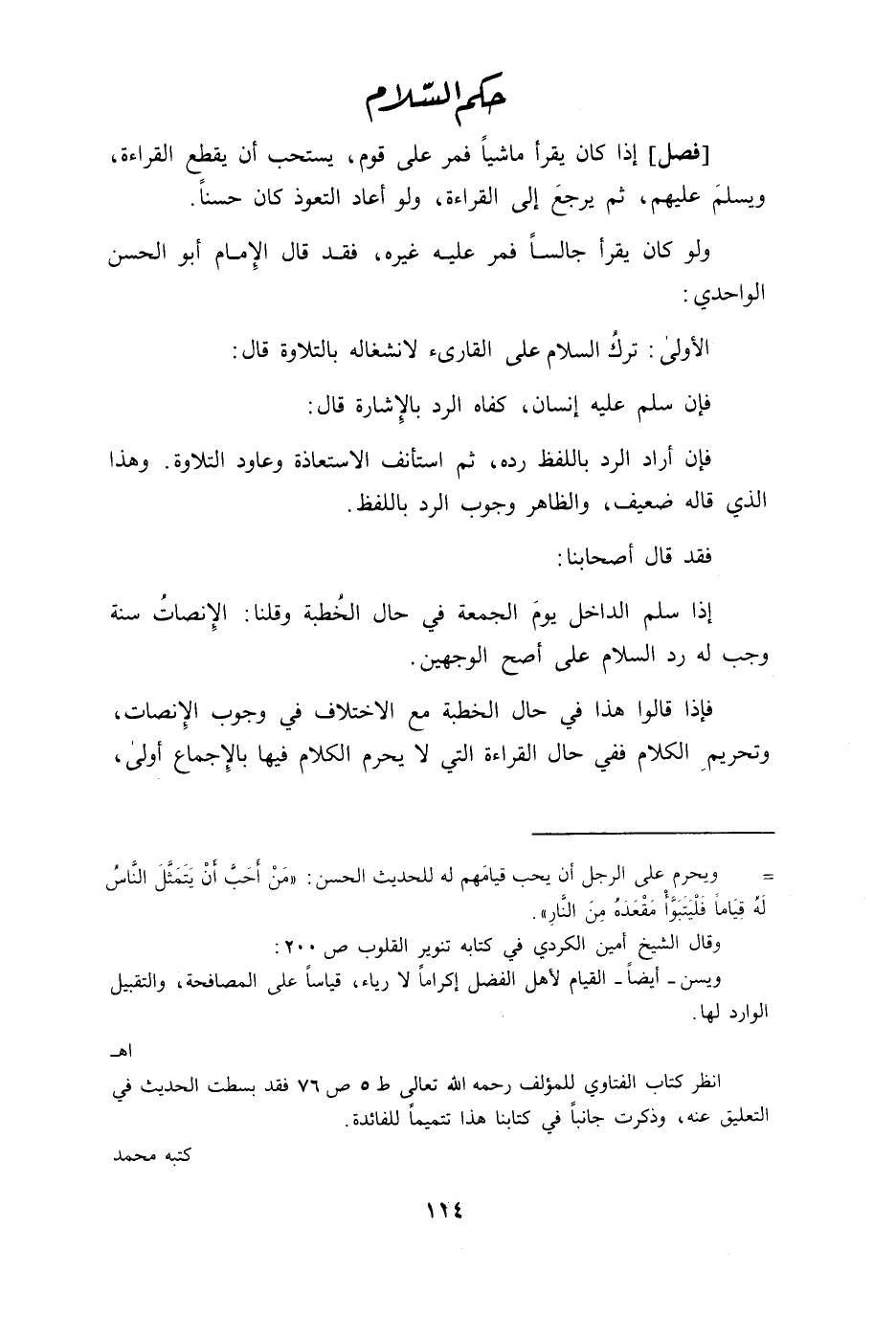 [فصل] إذا كان يقرأ ماشيا فمر على قوم يستحب ان يقطع القراءة ويسلم عليهم ثم يرجع الى القراءة ولو أعاد التعوذ كان حسنا ولو كان يقرأ جالسا فمر عليه غيره فقد قال الامام ابو الحسن الواحدي الأولى ترك السلام على القارئ لاشتغاله بالتلاوة قال فان سلم عليه إنسان كفاه الرد بالاشارة قال فان أراد الرد باللفظ رده ثم استأنف الاستعاذة وعاود التلاوة وهذا الذي قاله ضعيف والظاهر وجوب الرد باللفظ فقد قال أصحابنا إذا سلم الداخل يوم الجمعة في حال الخطبة وقلنا الإنصات سنة وجب له رد السلام على أصح الوجهين فاذا قالوا هذا في حال الخطبة مع الاختلاف في وجوب الإنصات وتحريم الكلام ففي حال القراءة التي لا يحرم الكلام فيها بالاجماع اولى