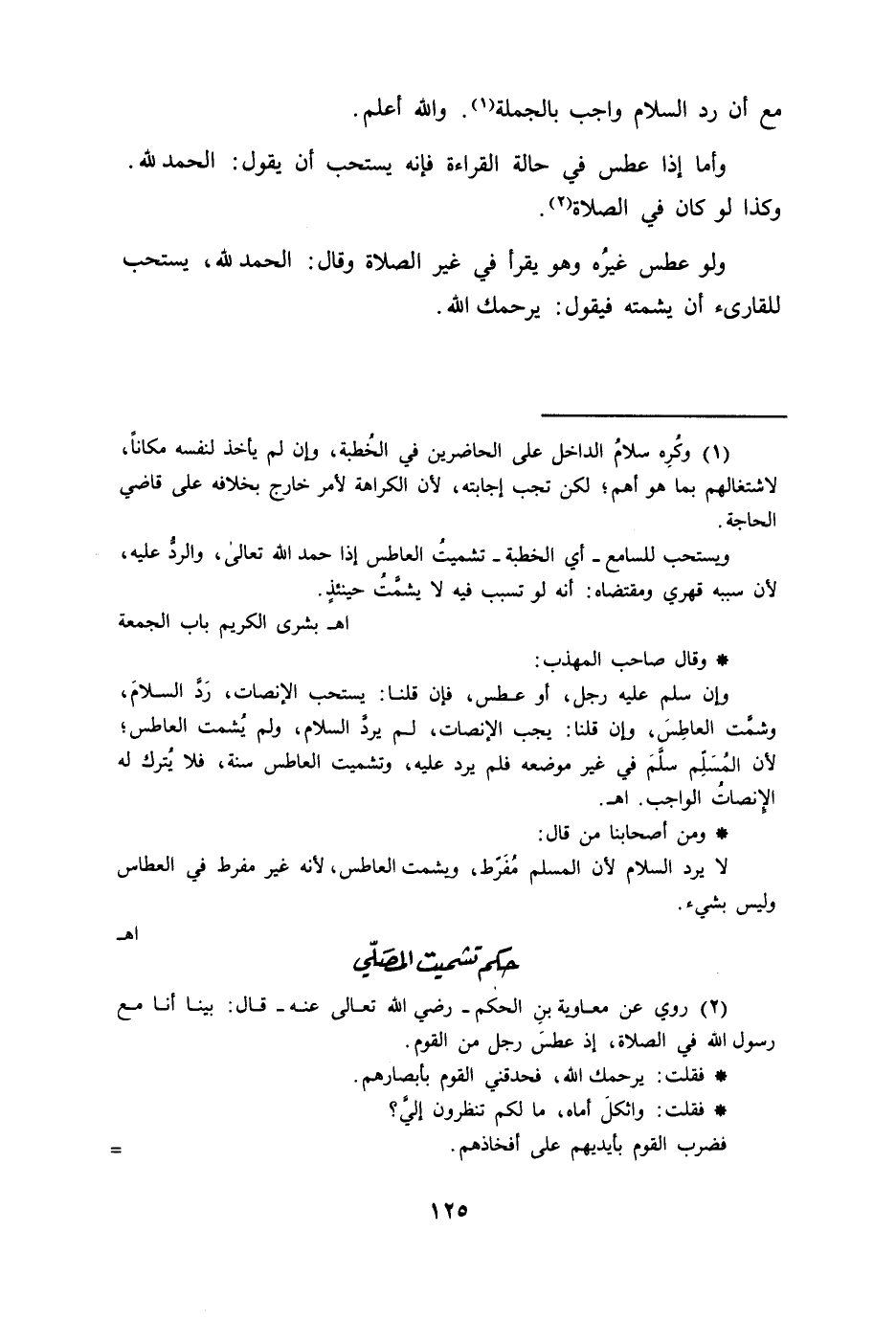 مع ان رد السلام واجب بالجملة والله أعلم وأما اذا عطس في حال القراءة فانه يستحب ان يقول الحمد لله وكذا لو كان في الصلاة ولو عطس غيره وهو يقرأ في غير الصلاة وقال الحمد لله يستحب للقارئ ان يشمته فيقول يرحمك الله