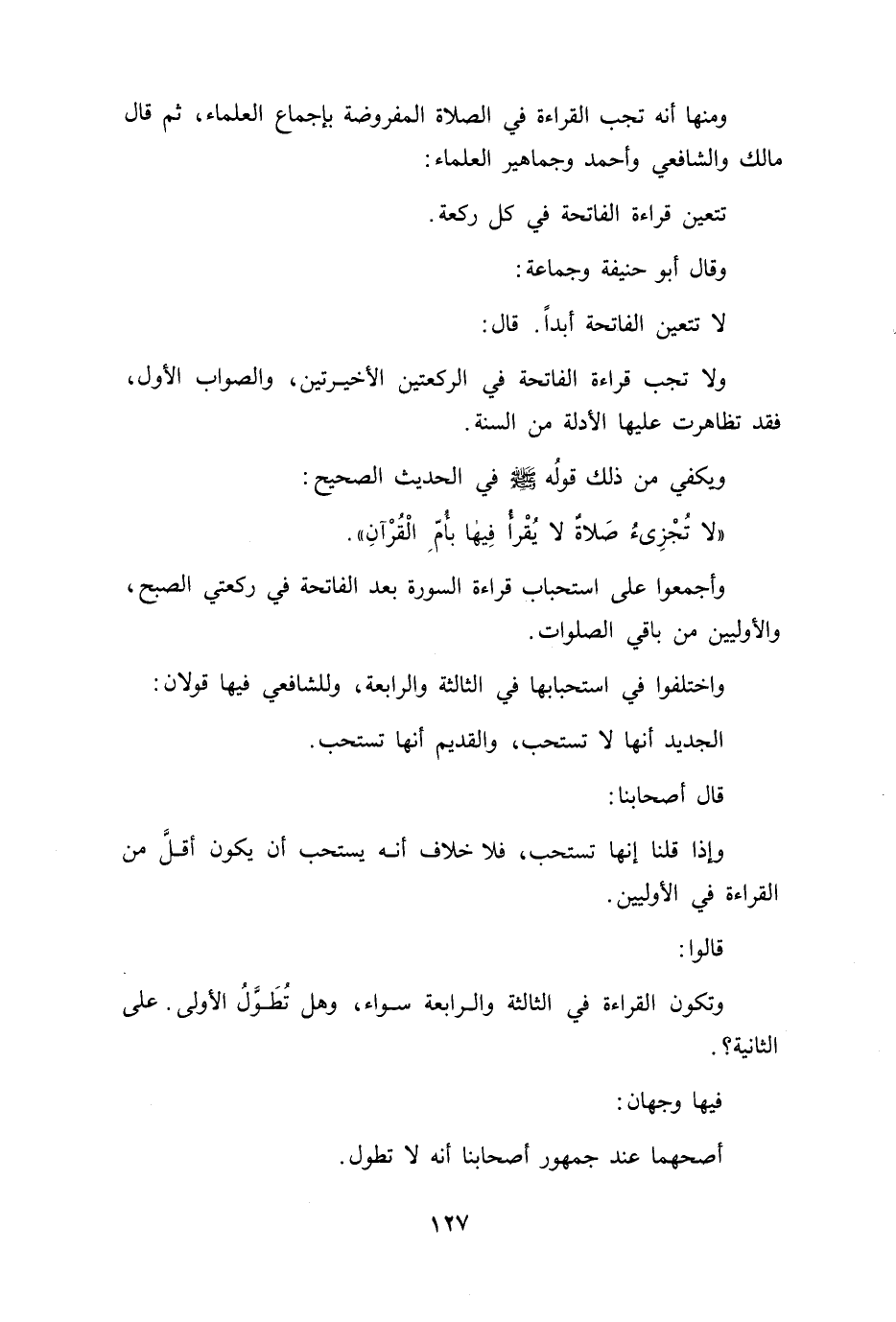 منها أنه يجب القراءة في الصلاة المفروضة بإجماع العلماء ثم قال مالك والشافعي وأحمد وجماهير العلماء تتعين قراءة الفاتحة في كل ركعة وقال أبو حنيفة وجماعة لا تتعين الفاتحة أبدا قال ولا تجب قراءة الفاتحة في الركعتين الأخيرتين والصواب الأول فقد تظاهرت عليها الادلة من السنة ويكفي من ذلك قوله صلى الله عليه وسلم: في الحديث الصحيح