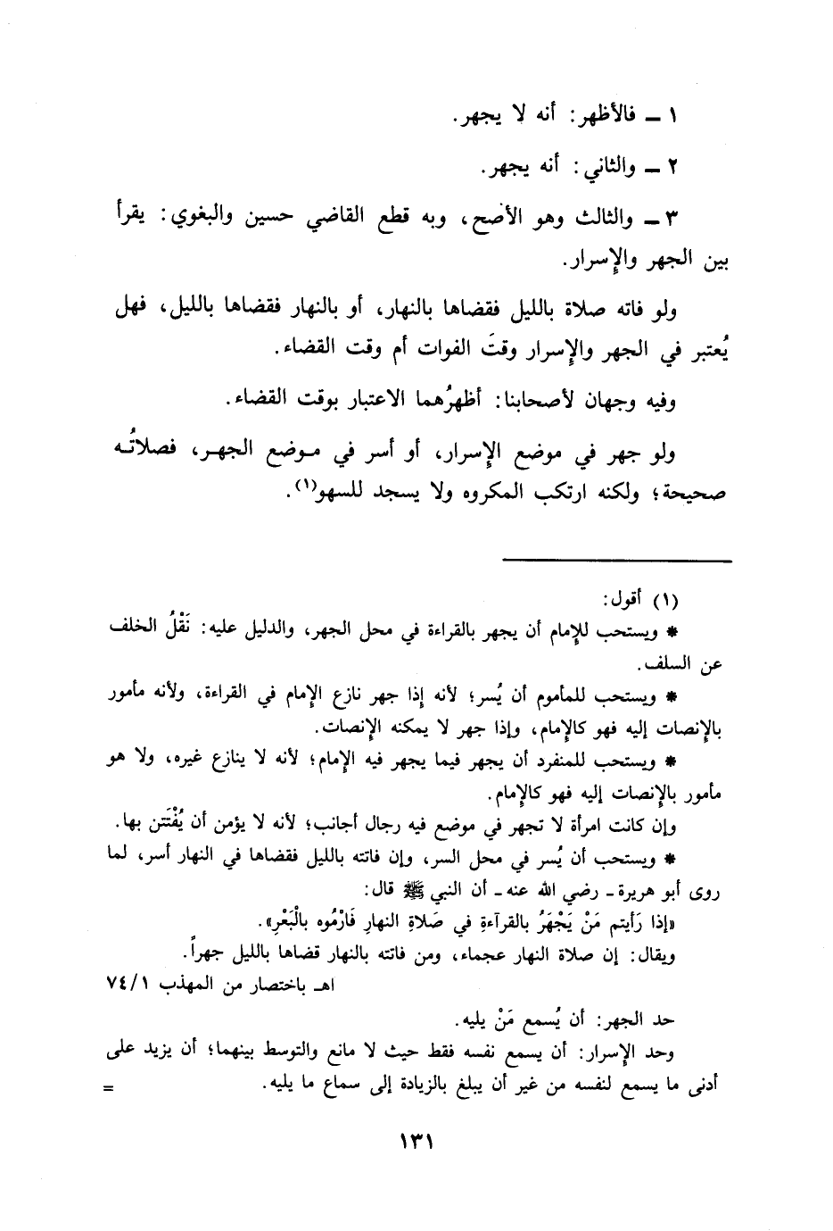 1 - فالأظهر انه لا يجهر 2 - والثاني أنه يجهر 3 - والثالث وهو الأصح وبه قطع القاضي حسين والبغوي يقرأ بين الجهر والاسرار ولو فاته صلاة بالليل فقضاها بالنهار أو بالنهار فقضاها بالليل فهل يعتبر في الجهر والإسرار وقت الفوات أم وقت القضاء