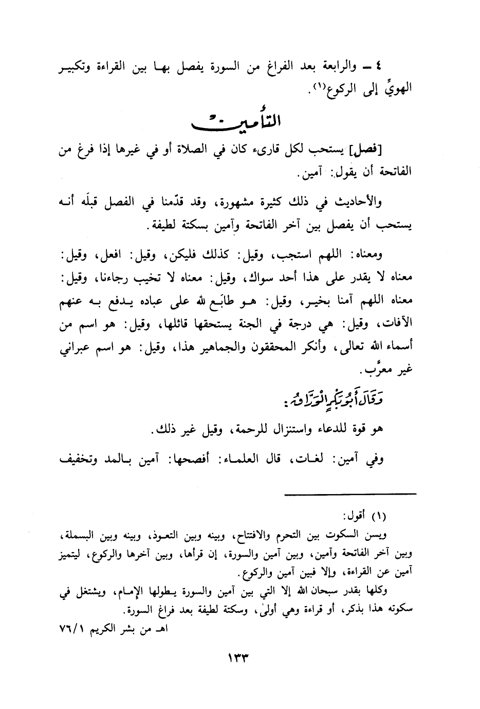 [فصل] يستحب لكل قارئ كان في الصلاة أو في غيرها إذا فرغ من الفاتحة أن يقول أمين والأحاديث في ذلك كثيرة مشهورة وقد قدمنا في الفصل قبله أنه يستحب أن يفصل بين آخر الفاتحة وآمين بسكتة لطيفة ومعناه اللهم استجب وقيل كذلك فليكن وقيل افعل وقيل معناه لا يقدر على هذا أحد سواك وقيل معناه لا تخيب رجاءنا وقيل معناه اللهم أمنا بخير وقيل هو طابع لله على عباده يدفع به عنهم الآفات وقيل هي درجة في الجنه يستحقها قائلها وقيل هو اسم من أسماء الله تعالى وأنكر المحققون والمجاهير هذا وقيل هو اسم عبراني غير معرب وقال أبو بكر الوراق هو قوة للدعاء واستنزال للرحمة وقيل غير ذلك وفي آمين لغات قال العلماء أفصحها آمين بالمد وتخفيف