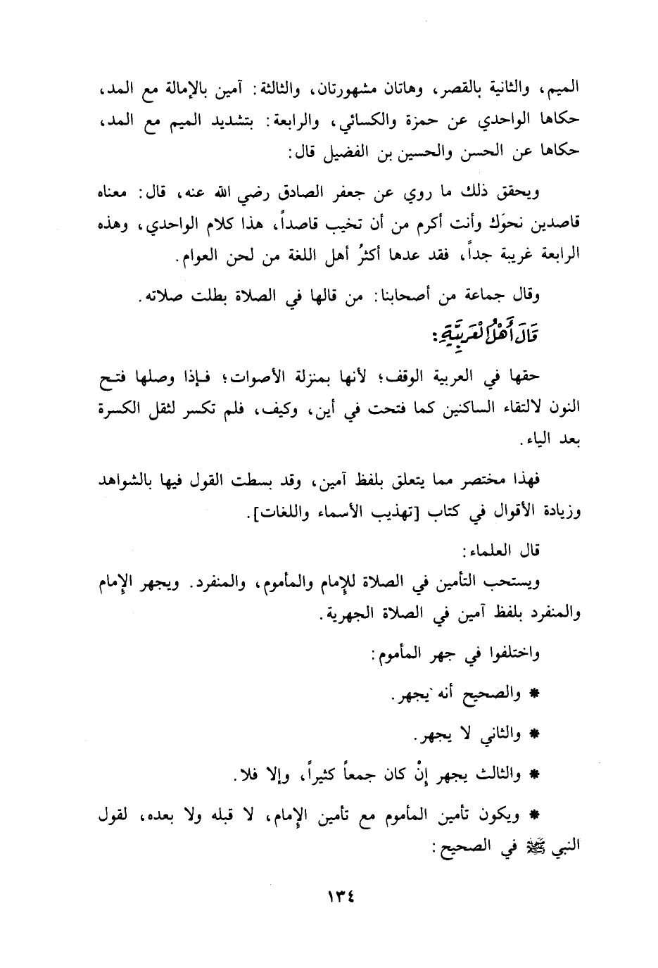 الميم والثانية بالقصر وهاتان مشهورتان والثالثة آمين بالامالة مع المد حكاها الواحدي عن حمزة والكسائي والرابعة بتشديد الميم مع المد حكاها عن الحسن والحسين ابن الفضيل قال ويحقق ذلك ما روي عن جعفر الصادق رضي الله عنه قال معناه قاصدين نحوك وأنت أكرم من أن تخيب قاصدا هذا كلام الواحدي وهذه الرابعة غريبة جدا فقد عدها أكثر أهل اللغة من لحن العوام وقال جماعة من أصحابنا من قالها في الصلاة بطلت صلاته قال أهل العربية حقها في العربية الوقف لأنها بمنزلة الاصوات فإذا وصلها فتح النون لالتقاء الساكنين كما فتحت في أين وكيف فلم تكسر لثقل الكسرة بعد الياء فهذا مختصر مما يتعلق بلفظ آمين وقد بسطت القول فيها بالشواهد وزيادة الاقوال في كتاب (تهذيب: الأسماء واللغات] قال العلماء ويستحب التأمين في الصلاة للامام والمنفرد ويجهر الإمام والمنفرد بلفظ آمين في صلاة الجهرية واختلفوا في جهر المأموم * والصحيح أنه يجهر * والثاني لا يجهر * والثالث يجهر إن كان جمعا كثيرا وإلا فلا * ويكون تأمين المأموم مع تأمين الإمام لا قبله ولا بعده لقول النبي صلى الله عليه وسلم: في الصحيح