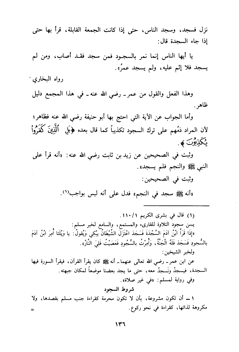 نزل فسجد وسجد الناس حتى إذا كانت الجمعة القابلة قرأ بها حتى إذا جاء السجدة قال يا أيها الناس إنما نمر بالسجود فمن سجد فقد أصاب ومن لم يسجد فلا إثم عليه ولم يسجد عمر رواه البخاري وهذا الفعل والقول من عمر رضي الله عنه في هذا المجمع دليل ظاهر وأما الجواب عن الآية التي احتج بها أبو حنيفة رضي الله عنه فظاهر لأن المراد ذمهم على ترك السجود تكذيبا كما قال تعالى بعده بل الذين كفروا يكذبون) وثبت في الصحيحين عن زيد بن ثابت رضي الله عنه أنه قرأ على النبي صلى الله عليه وسلم: والنجم فلم يسجد وثبت في الصحيحين أنه صلى الله عليه وسلم: سجد في النجم فدل على أنه ليس بواجب