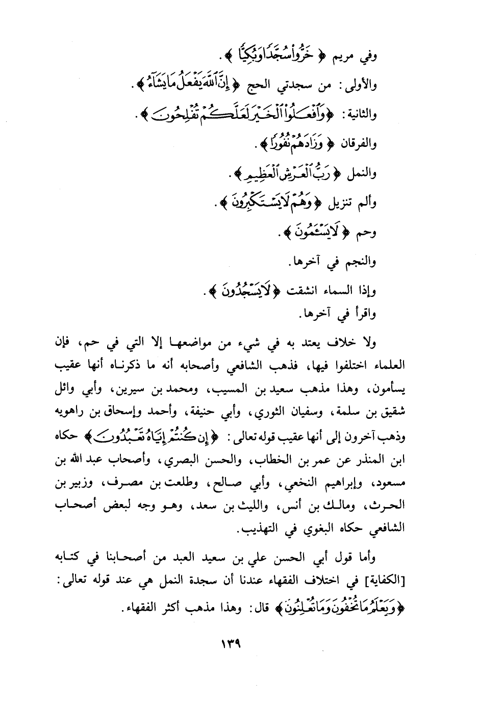 وفي مريم خروا سجدا وبكيا والاولى من سجدتي الحج إن الله يفعل ما يشاء والثانية وافعلوا الخير لعلكم تفلحون والفرقان وزادهم نفورا والنمل رب العرش العظيم وألم تنزيل وهم لا يستكبرون وحم لا يسأمون والنجم في آخرها وإذا السماء انشقت لا يسجدون واقرأ في آخرها ولا خلاف يعتد به في شئ من مواضعها إلا التي في حم فإن العلماء أختلفوا فيها فذهب الشافعي وأصحابه إنها ما ذكرناه إنها عقيب يسأمون وهذا مذهب سعيد بن المسيب ومحمد بن سيرين وأبي وائل شقيق ابن سلمة وسفيان الثوري وأبي حنيفة وأحمد وإسحق بن راهويه وذهب آخرون إلى أنها عقيب قوله تعالى إن كنتم إياه تعبدون حكاه ابن المنذر عن عمر بن الخطاب والحسن البصري وأصحاب عبد الله بن مسعود وإبراهيم النخعي وأبي صالح وطلعت بن مصرف وزبير بن الحرث ومالك بن أنس والليث بن سعد وهو وجه لبعض أصحاب الشافعي حكاه البغوي في التهذيب وأما قول أبي الحسن علي بن سعيد العبد من اصحابنا في كتابه [الكفاية في اختلاف الفقهاء عندنا أن سجدة النمل هي عند قوله تعالى (ويعلم ما يخفون وما يعلنون قال وهذا مذهب أكثر الفقهاء