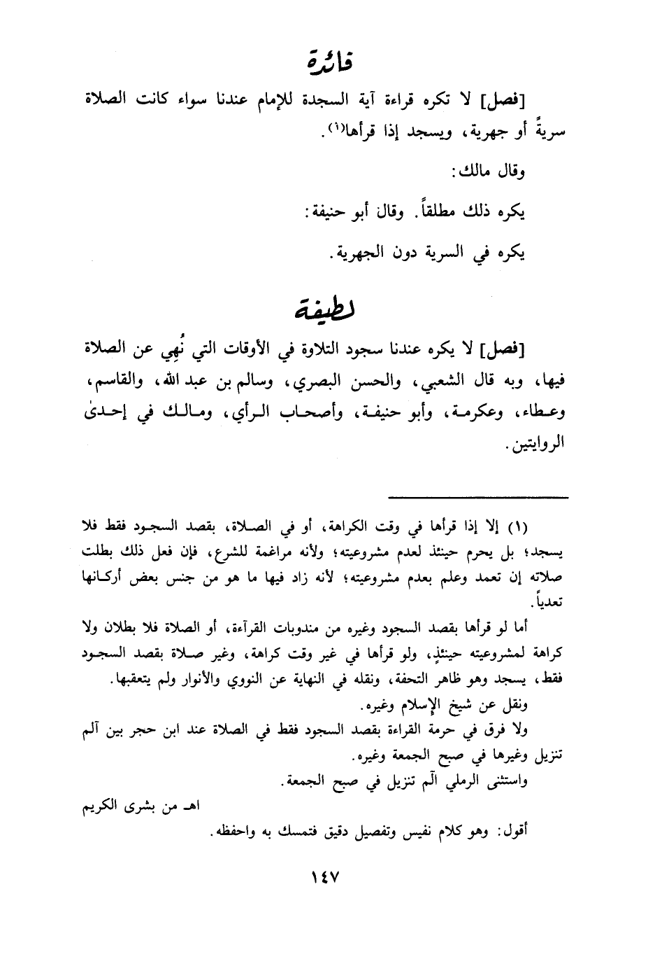 [فصل] لا تكره قراءة آية السجدة للأمام عندنا سواء كانت الصلاة سرية أو جهرية ويسجد إذا قرأها وقال مالك يكره ذلك مطلقا وقال أبو حنيفة يكره في السرية دون الجهرية