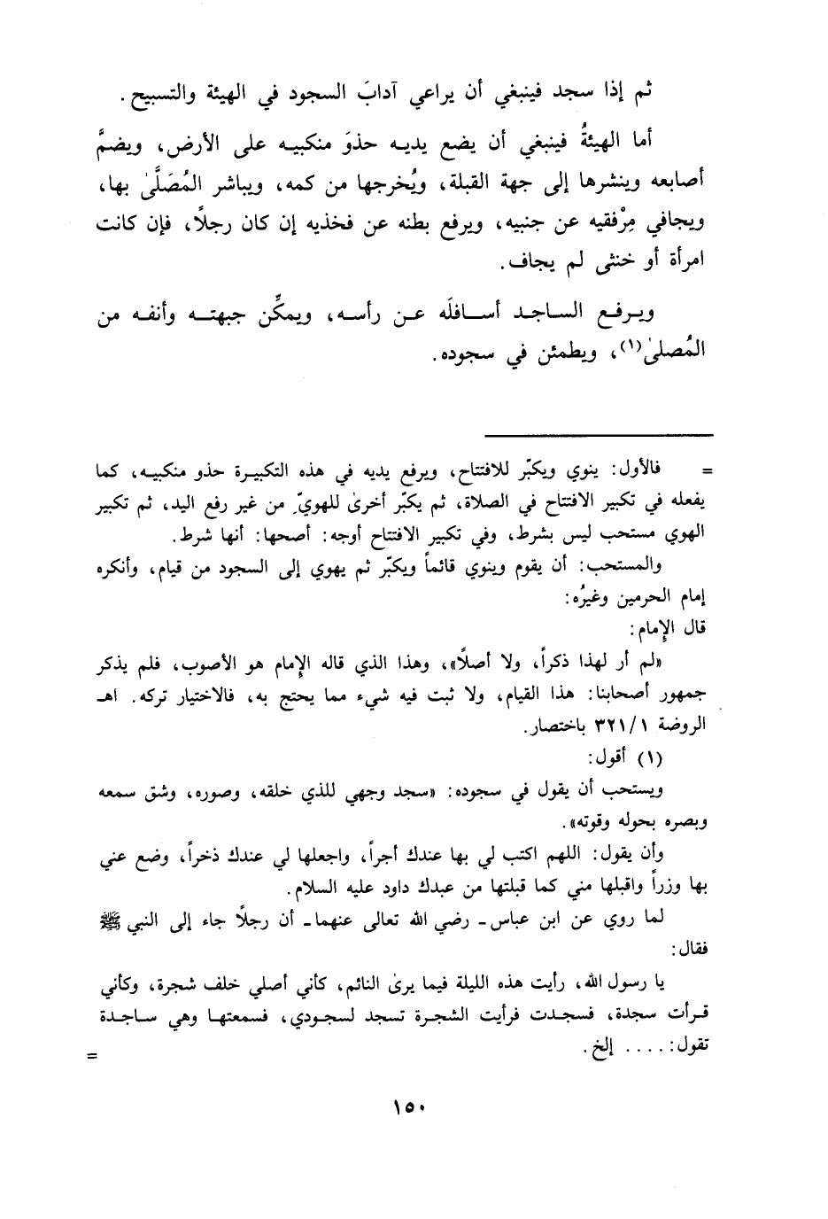 ثم إذا سجد فينبغي أن يراعي آداب السجود في الهيئة والتسبيح أما الهيئة فينبغي أن يضع يديه حذو منكبيه على الأرض ويضم أصابعه وينشرها إلى جهة القبلة ويخرجها من كمه ويباشر المصلى بها ويجافي مرفقيه عن جنبيه ويرفع بطنه عن فخذيه إن كان رجلا فإن كانت امرأة أو خنثى لم يجاف ويرفع الساجد أسافله على رأسه ويمكن جبهته وأنفه من المصلى ويطمئن في سجوده