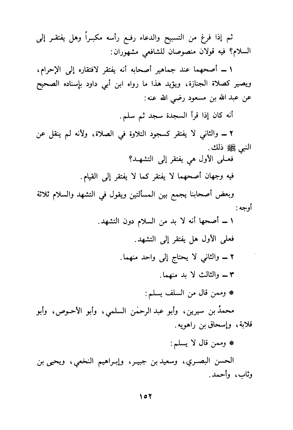 ثم إذا فرغ من التسبيح والدعاء رفع رأسه مكبرا وهل يفتقر إلى السلام فيه قولان منصوصان للشافعي مشهوران 1 - أصحهما عند جماهير أصحابه أنه يفتقر لافتقاره إلى الإحرام ويصير كصلاة الجنارة ويؤيد هذا ما رواه ابن أبي داود بإسناده الصحيح عن عبد الله بن مسعود رضي الله عنه أنه كان إذا قرأ السجدة سجد ثم سلم 2 - والثاني لا يفتقر كسجود التلاوة في الصلاة ولأنه لم ينقل عن النبي صلى الله عليه وسلم: ذلك فعلى الأول هل يفتقر إلى التشهد؟ فيه وجهان أصحهما لا يفتقر كما لا يفتقر إلى القيام وبعض أصحابنا يجمع بين المسألتين ويقول في التشهد والسلام ثلاثة أوجه 1 - أصحها أنه لا بد من السلام دون التشهد 2 - والثاني لا يحتاج إلى واحد منهما 3 - والثالث لا بد منهما * وممن قال من السلف يسلم محمد بن سيرين وأبو عبد الرحمن السلمي وأبو الأحوص وأبو قلابة وإسحاق بن راهويه * وممن قال لا يسلم الحسن البصري وسعيد بن جبير وإبراهيم النخعي ويحيى بن وثاب وأحمد
