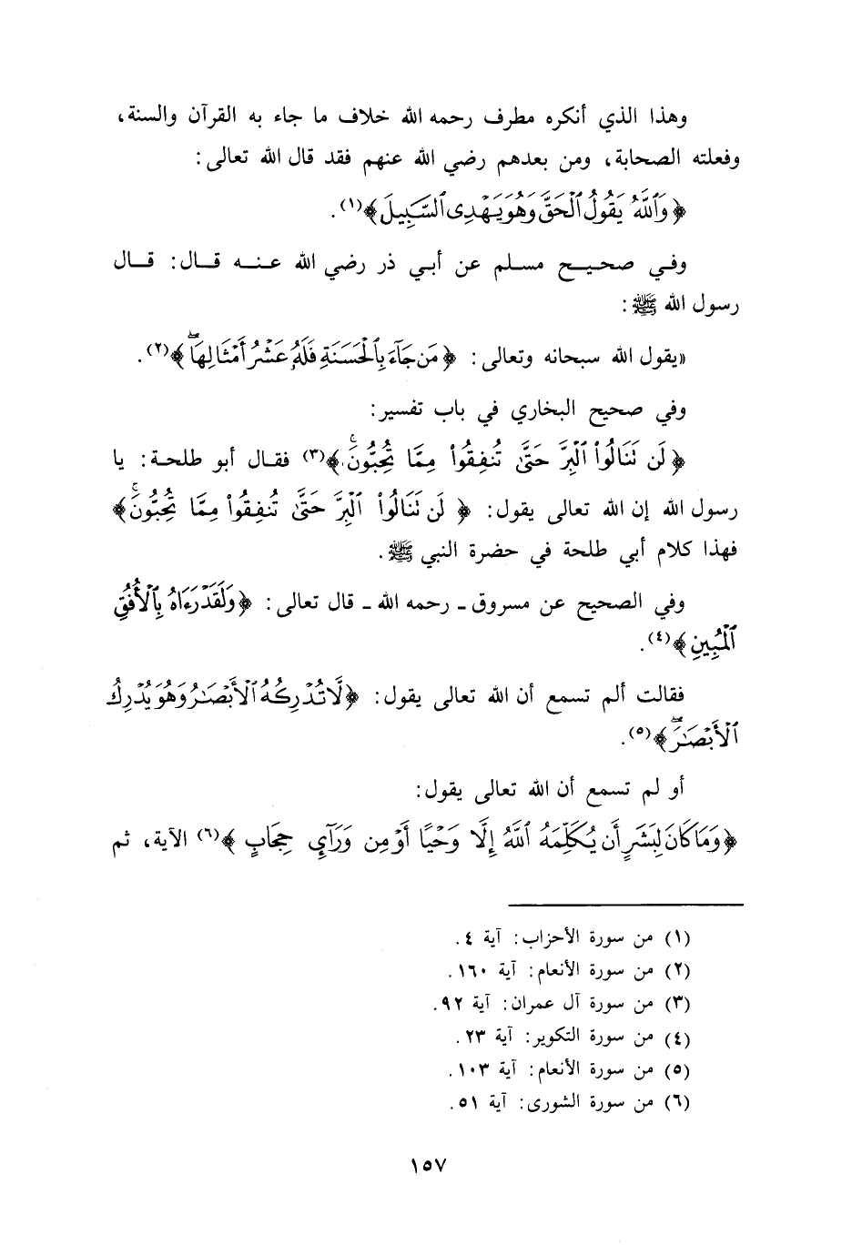 وهذا الذي أنكره مطرف رحمه الله خلاف ما جاء به القرآن والسنة وفعلته الصحابة ومن بعدهم رضي الله عنهم فقد قال الله تعالى (والله يقول الحق وهو يهدي السبيل) وفي صحيح مسلم عن أبي ذر رضي الله عنه قال قال رسول الله صلى الله عليه وسلم: يقول الله سبحانه وتعالى من جاء بالحسنة فله عشر أمثالها) وفي صحيح البخاري في باب تفسير (لن تنالوا البر حتى تنفقوا مما تحبون فقال أبو طلحة يا رسول الله إن الله تعالى يقول لن تنالوا البر حتى تنفقوا مما تحبون) فهذا كلام أبي طلحة في حضرة النبي صلى الله عليه وسلم: وفي الصحيح عن مسروق رحمه الله قال قلت لعائشة رضي الله عنها ألم يقل الله تعالى ولقد رآه بالأفق المبين) فقالت ألم تسمع أن الله تعالى يقول لا تدركه الأبصار وهو يدرك الأبصار) أو لم تسمع أن الله تعالى يقول (وما كان لبشر أن يكلمه الله إلا وحيا أو من وراء حجاب الآية ثم