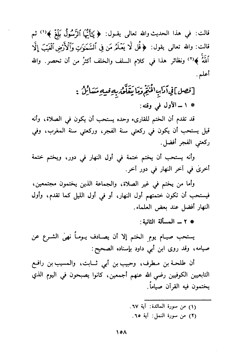 1 - الأولى في وقته قد تقدم أن الختم للقارئ وحده يستحب أن يكون في الصلاة وأنه قيل يستحب أن يكون في ركعتي سنة الفجر وركعتي سنة المغرب وفي ركعتي الفجر أفضل وأنه يستحب أن يختم ختمة في أول النهار في دور ويختم ختمة أخرى في آخر النهار في دور آخر وأما من يختم في غير الصلاة والجماعة الذين يختمون مجتمعين فيستحب أن تكون ختمتهم يقول أول النهار أو في أول الليل كما تقدم وأول النهار أفضل عند بعض العلماء * 2 - المسألة الثانية يستحب صيام يوم الختم إلا أن يصادف يوما نهى الشرع عن صيامه وقد روى ابن أبي داود باسناده الصحيح أن طلحة بن مطرف وحبيب بن أبي ثابت والمسيب بن رافع التابعيين الكوفيين رضي الله عنهم أجمعين كانوا يصبحون في اليوم الذي يختمون فيه القرآن صياما