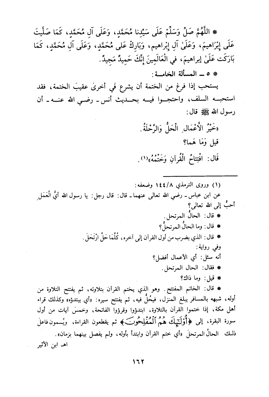 * اللهم صل وسلم على سيدنا محمد وعلى آل محمد كما صليت على ابراهيم وعلى آل ابراهيم وبارك على محمد وعلى آل محمد كما باركت على إبراهيم وعلى آل إبراهيم في العالمين إنك حميد مجيد * 5 - المسألة الخامسة يستحب إذا فرغ من الختمة أن يشرع في أخرى عقيب الختمة فقد